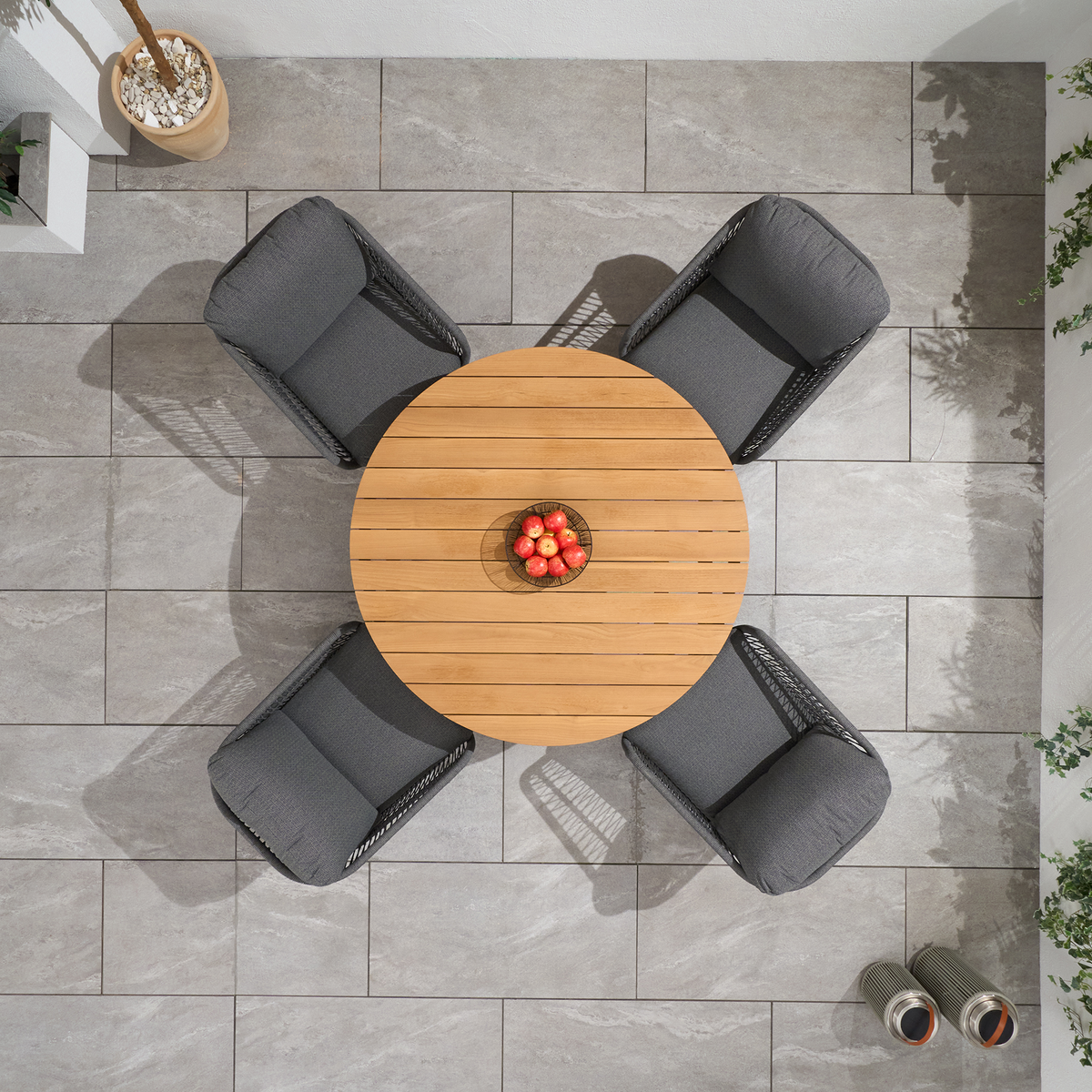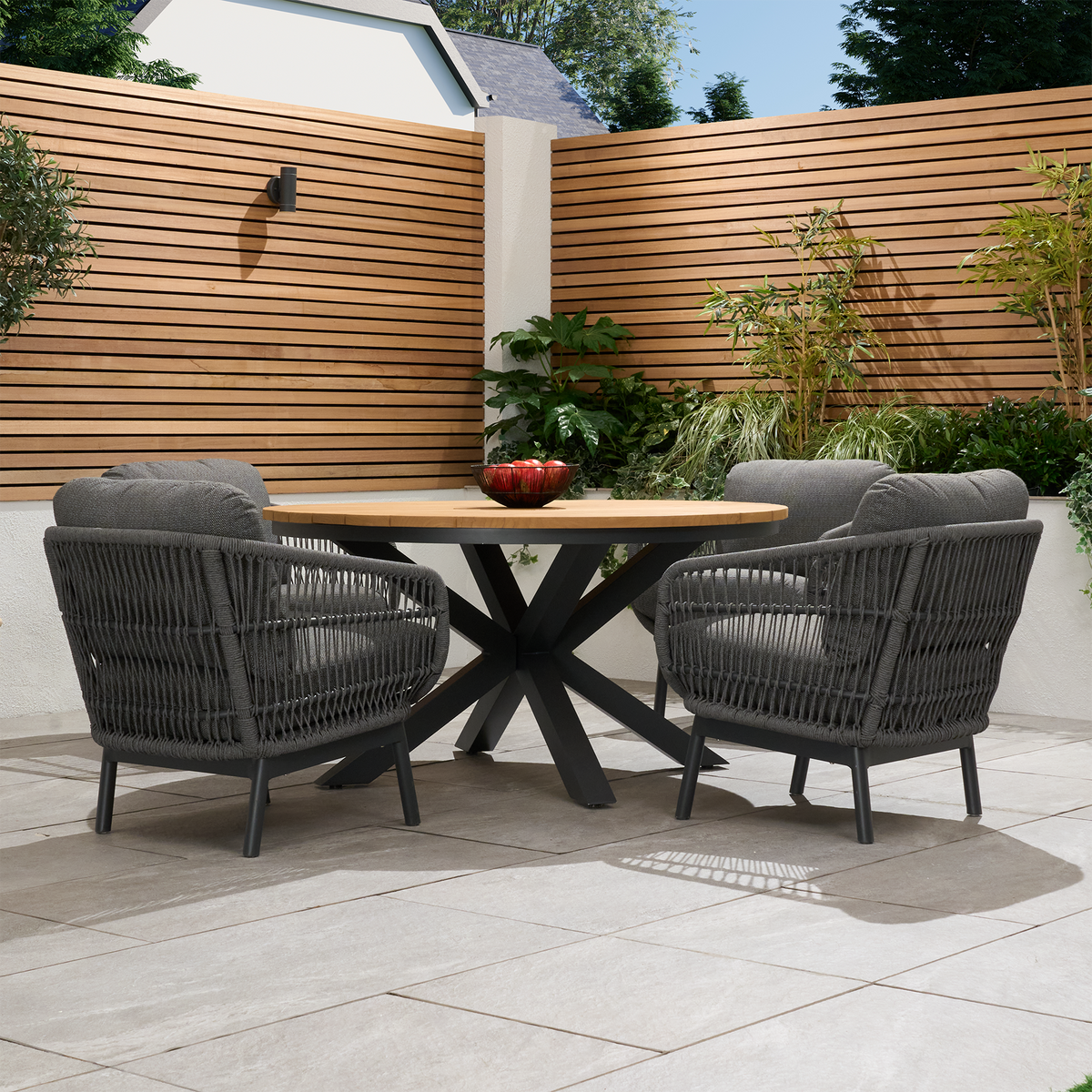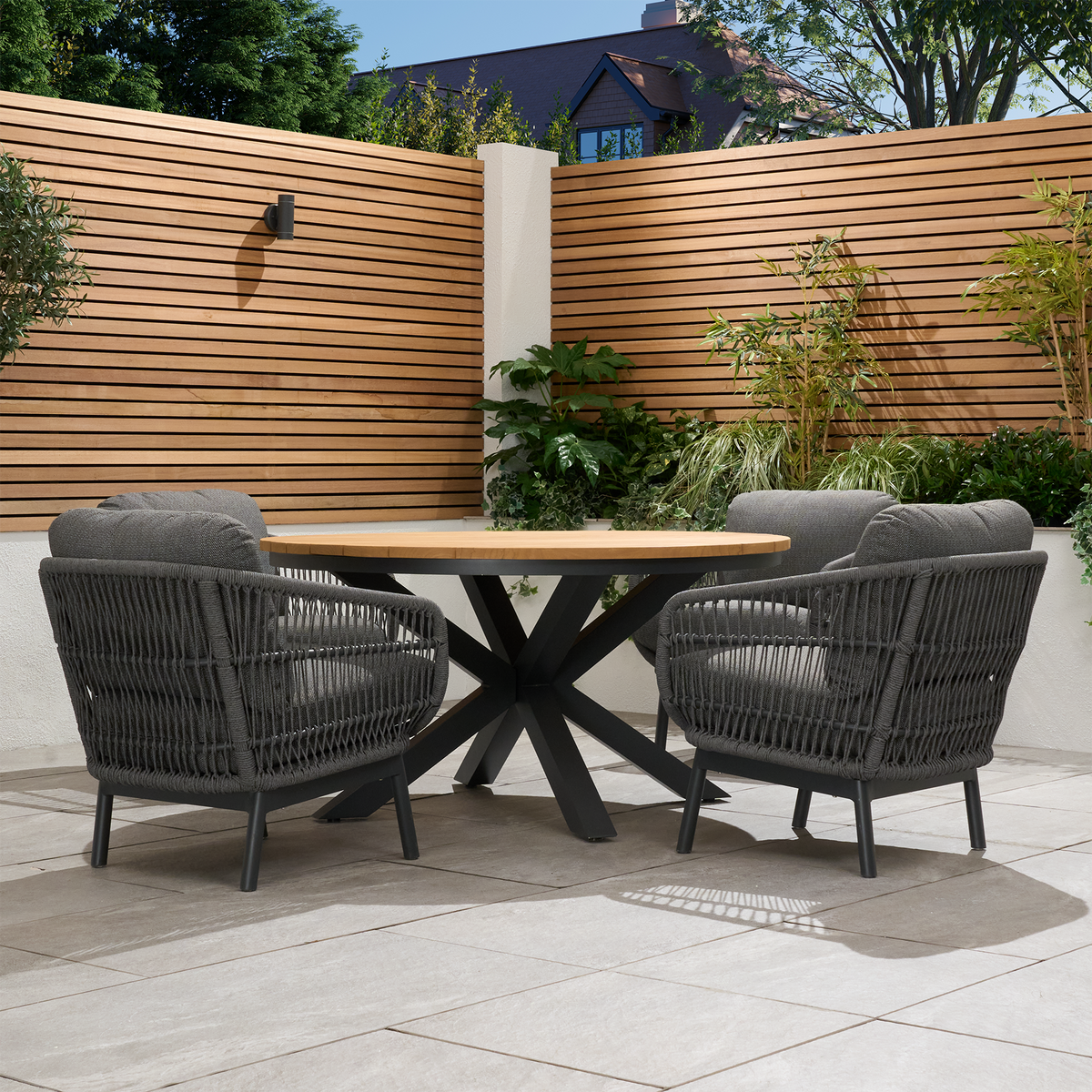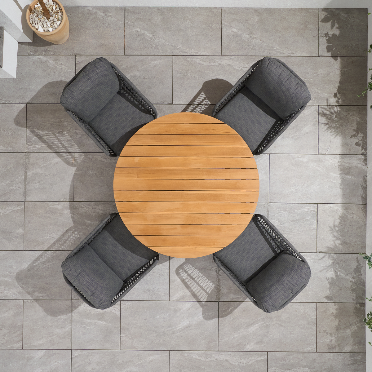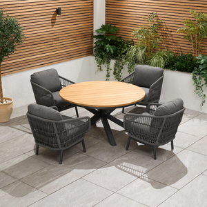 The teak top on the round outdoor dining table elevates the entire outdoor furniture set! The natural beauty and warmth of teak wood add such a timeless, luxurious feel to the table. Pairing it with modern aluminium legs is a smart design choice, too - it gives the garden furniture set a contemporary edge while ensuring that it is lightweight and resistant to the elements.