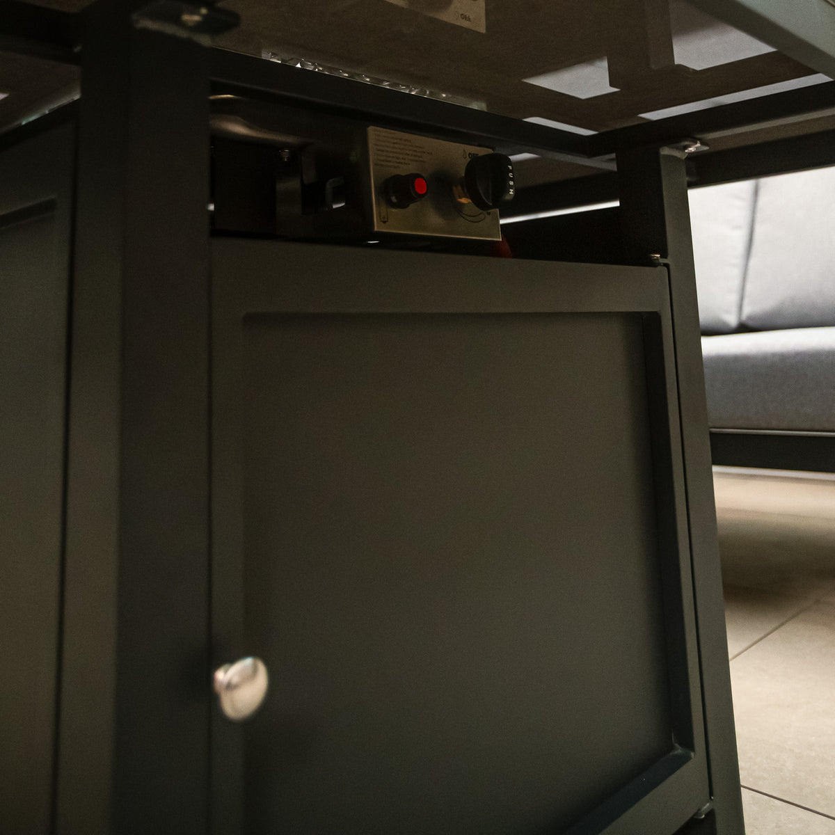 The fire put runs on LPG, and the table can easily fit a 5kg "Patio Gas" bottle inside.