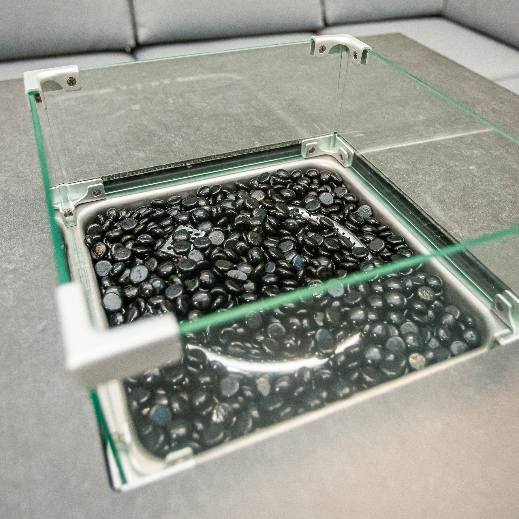 The glass similar to the aluminium frame is likely to collect dirt or dust, this may also get water drying marks; this can be cleaned with any household window cleaner and wiped dry of any residue. Do not clean the firepit glass immediately after use, allow the table and glass to fully cool (if purchasing an applicable set)