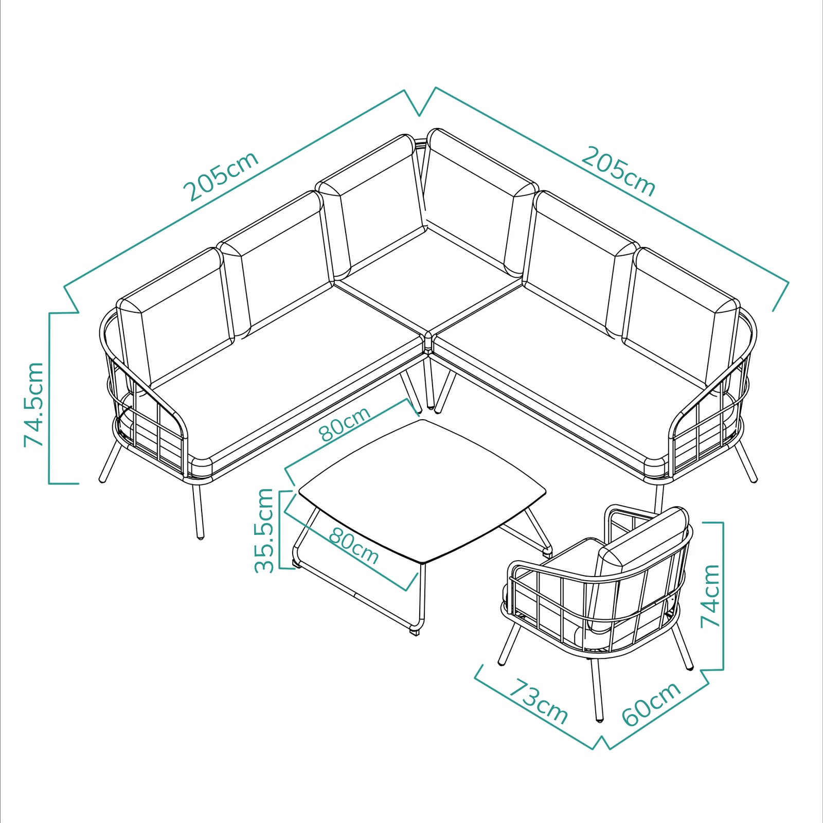 This metal garden furniture set can also be changed to meet your specific needs thanks to the flexible corner layout of the garden sofa.