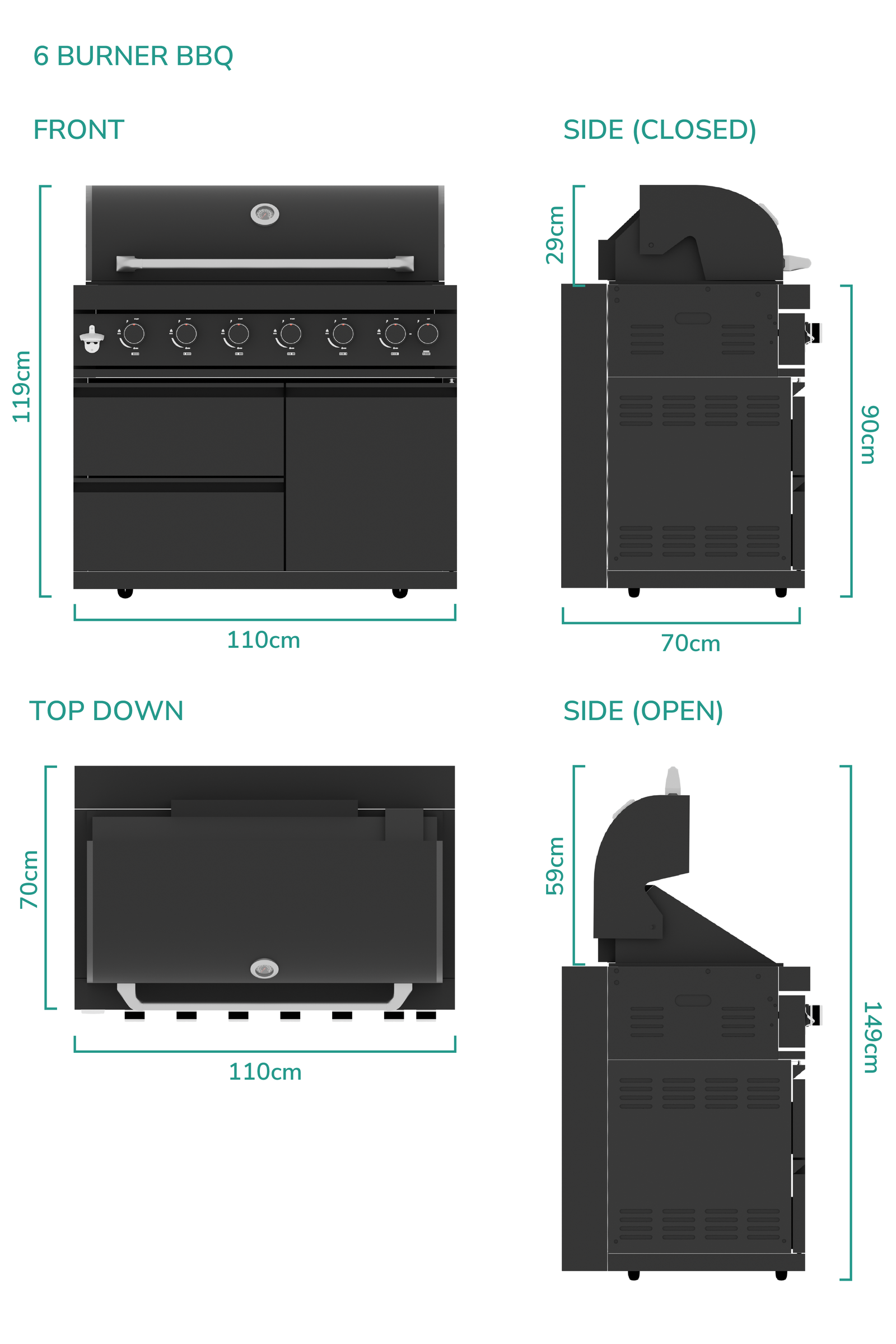 • Nero 6 Burner BBQ Dimensions: 119cm (H) x 110cm (W) x 73.5cm (D)