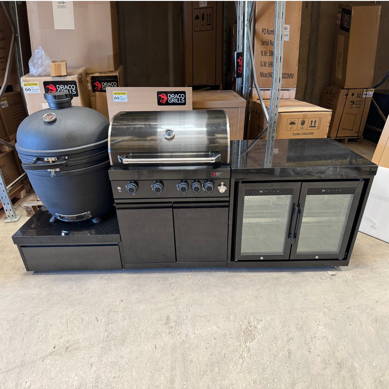 Ex Display Draco Grills 4 Burner BBQ Black Stainless Steel Modular Outdoor Kitchen with Kamado Egg and Double Fridge