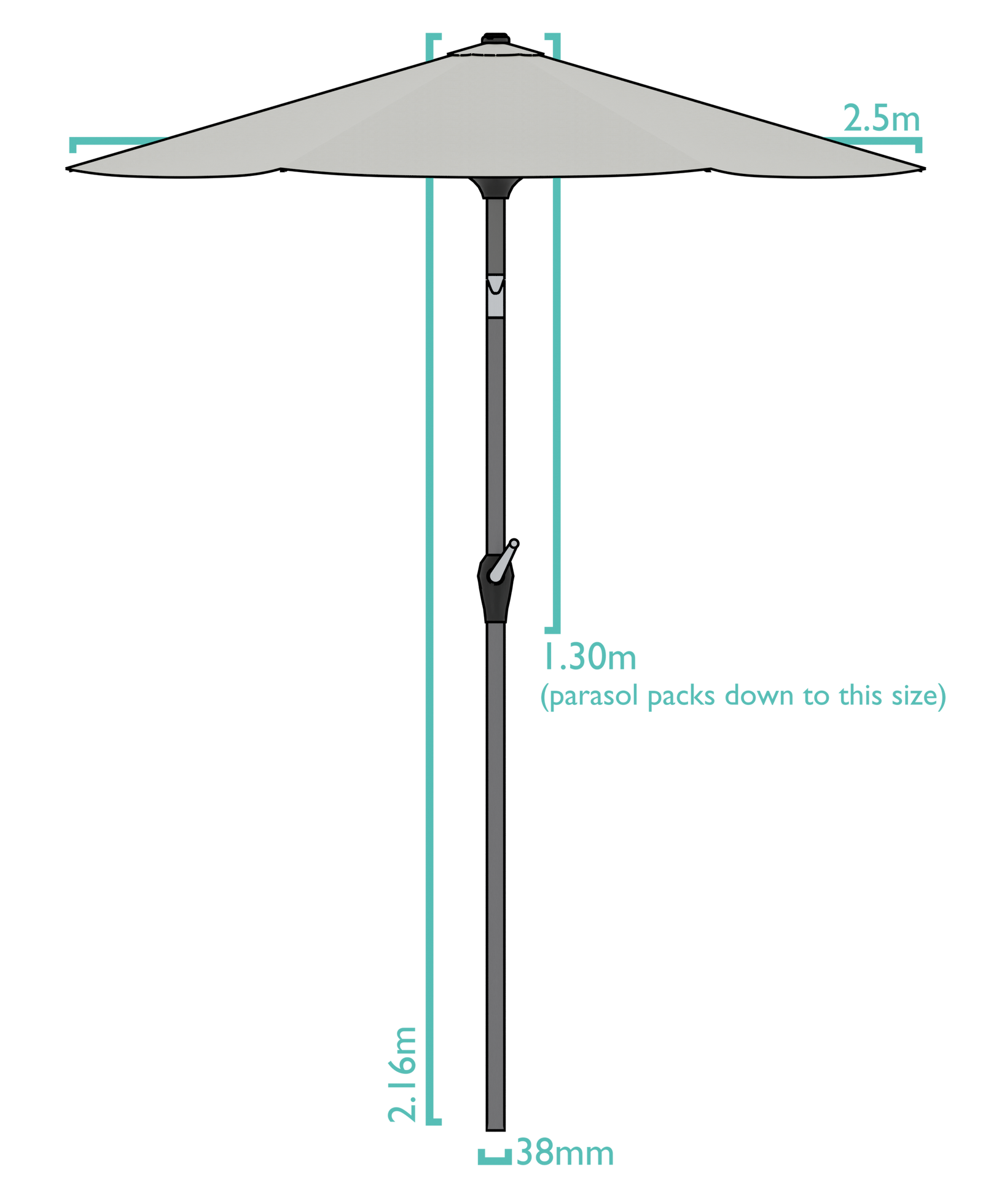 • The Bracken Outdoors 2.5m Aluminium Crank and Tilt Round Garden Parasol with a 38mm diameter pole is perfect for a variety of outdoor furniture sets.