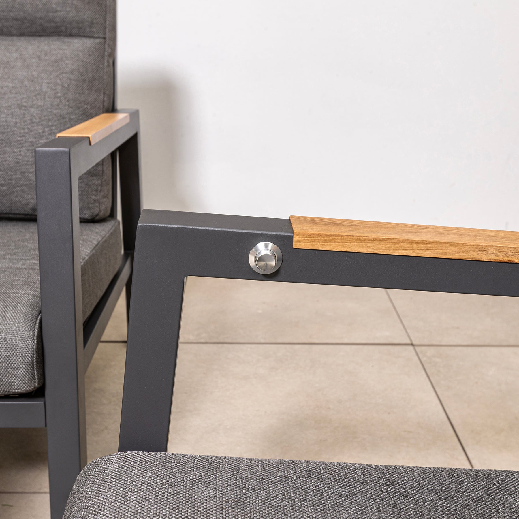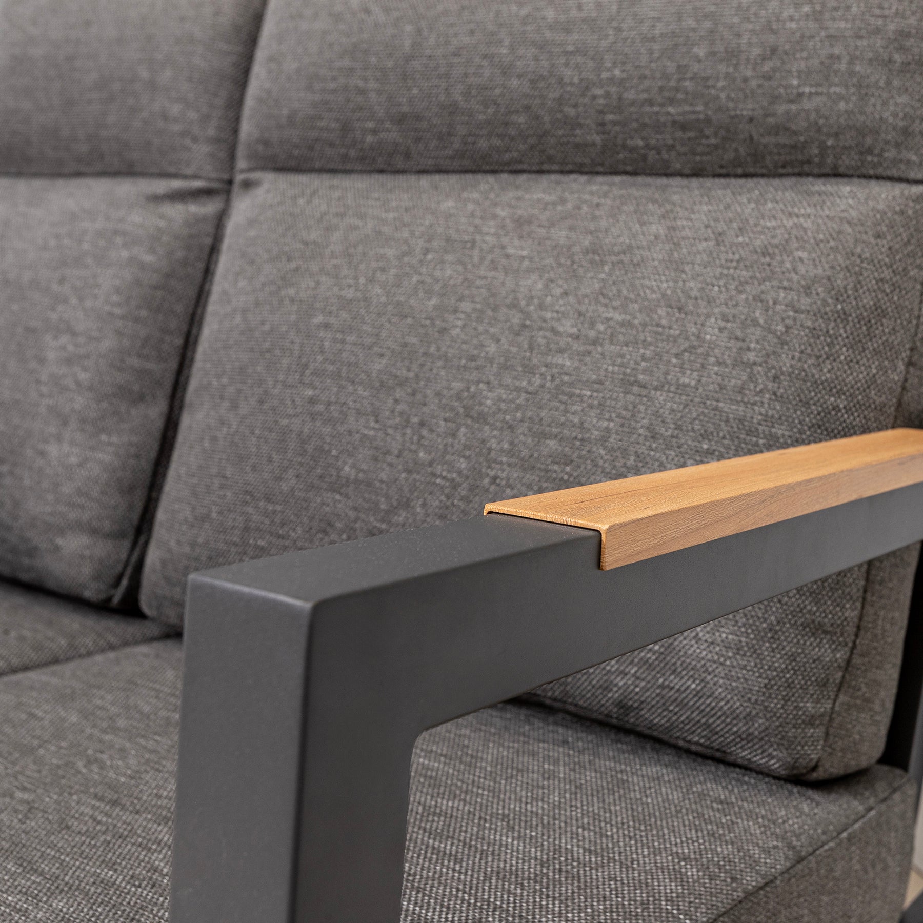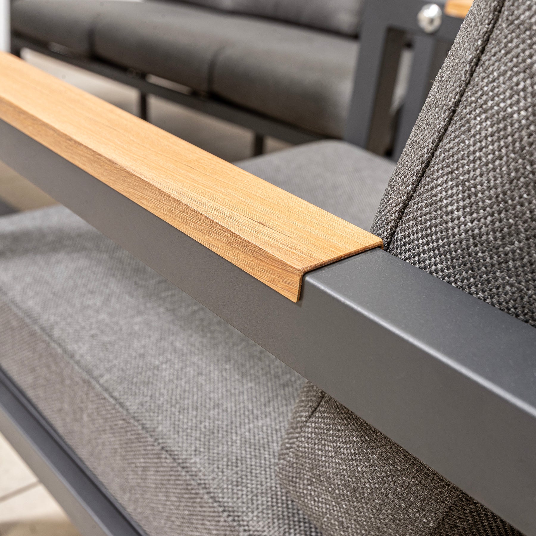 • Teak arms on the chairs and sofa