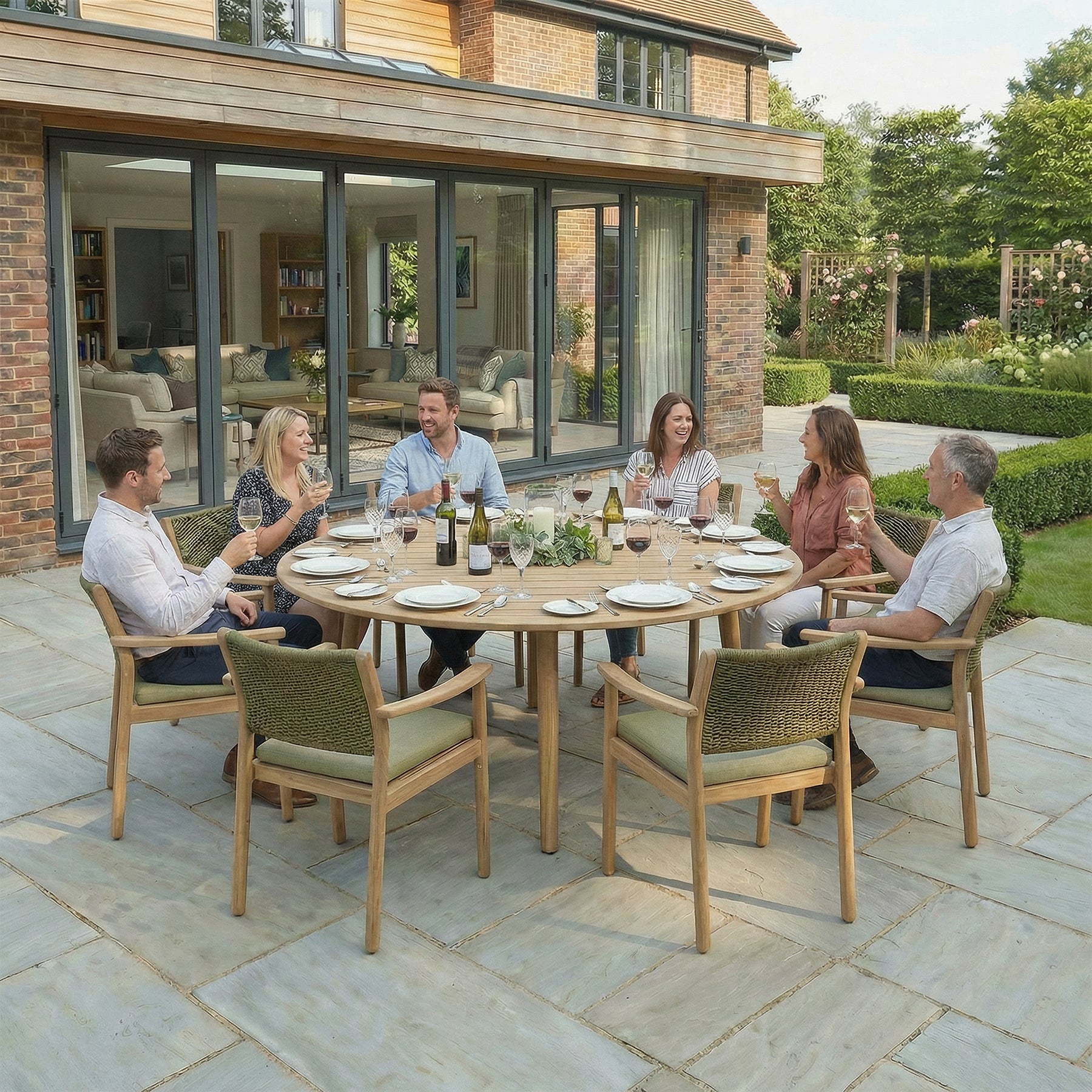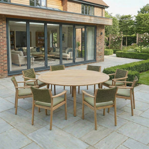 Crafted from high-quality acacia wood, the Tetbury dining set offers excellent strength and weather resistance, making it a reliable choice for long-lasting outdoor furniture. The natural wood finish brings warmth and character to patios, terraces, and gardens, while blending effortlessly with both classic and contemporary outdoor spaces.