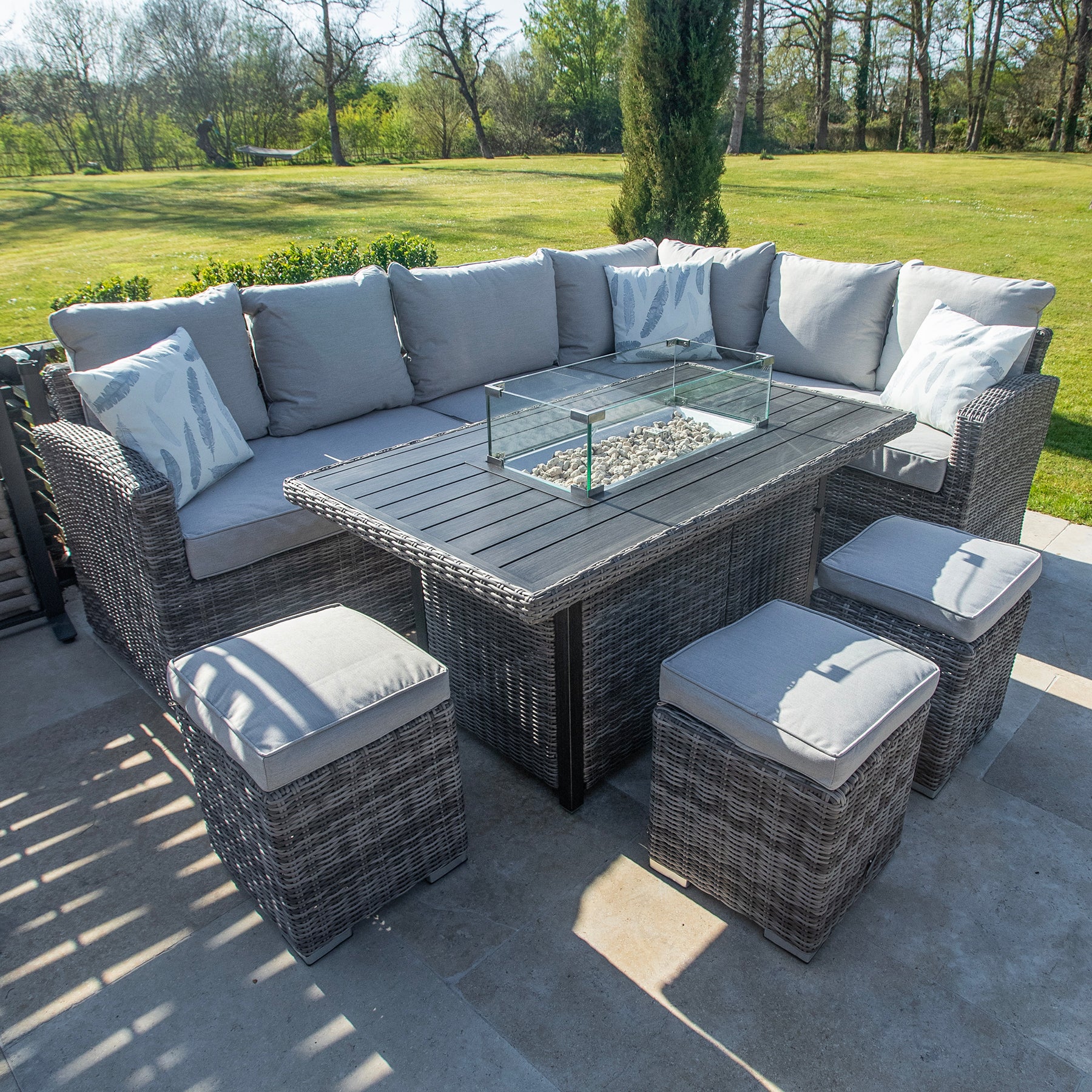 Choose from round dining sets with a central square fire pit to enjoy dinners or casual dining sets with a long rectangular or square gas fire pit to relax outside with loved ones even when it is dark.