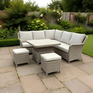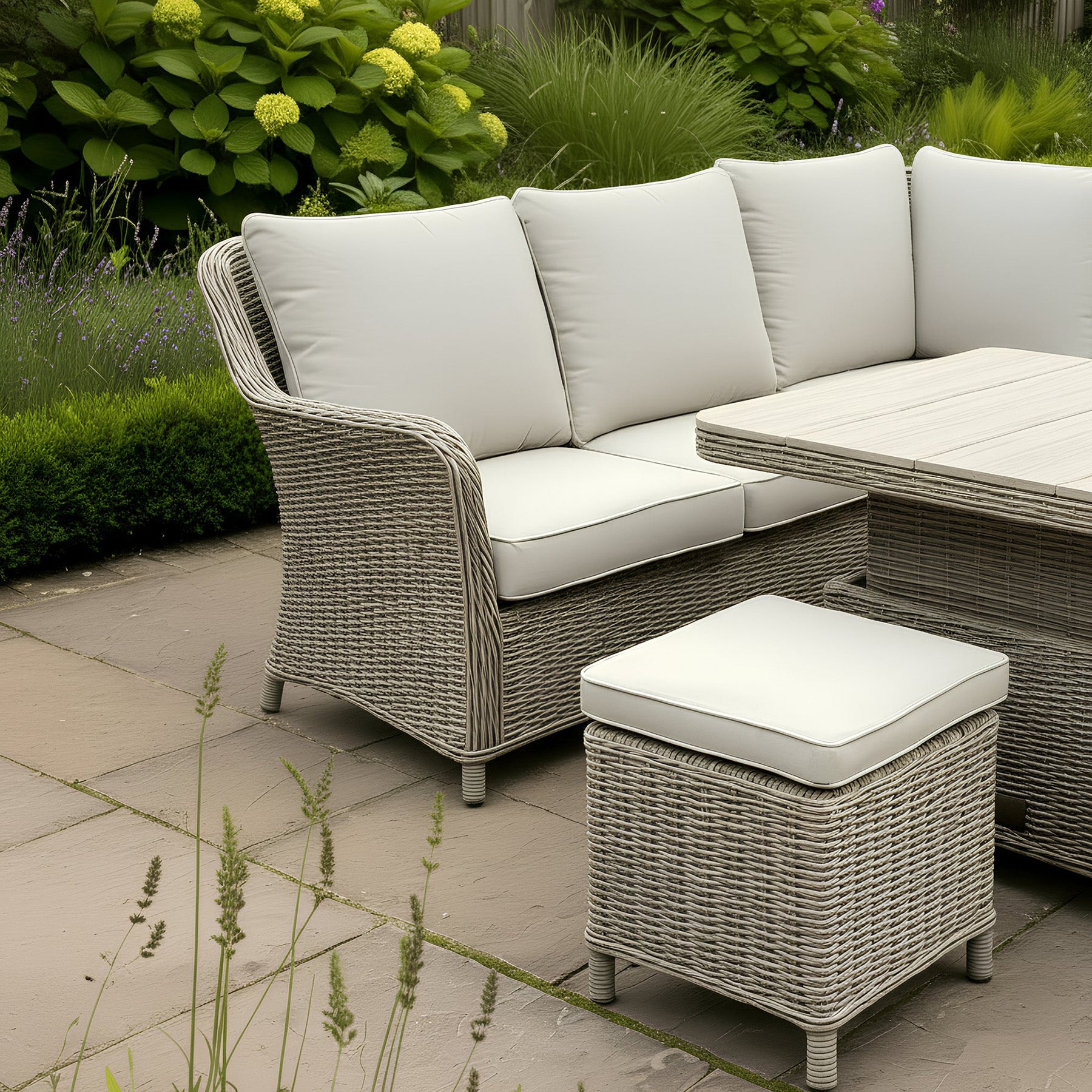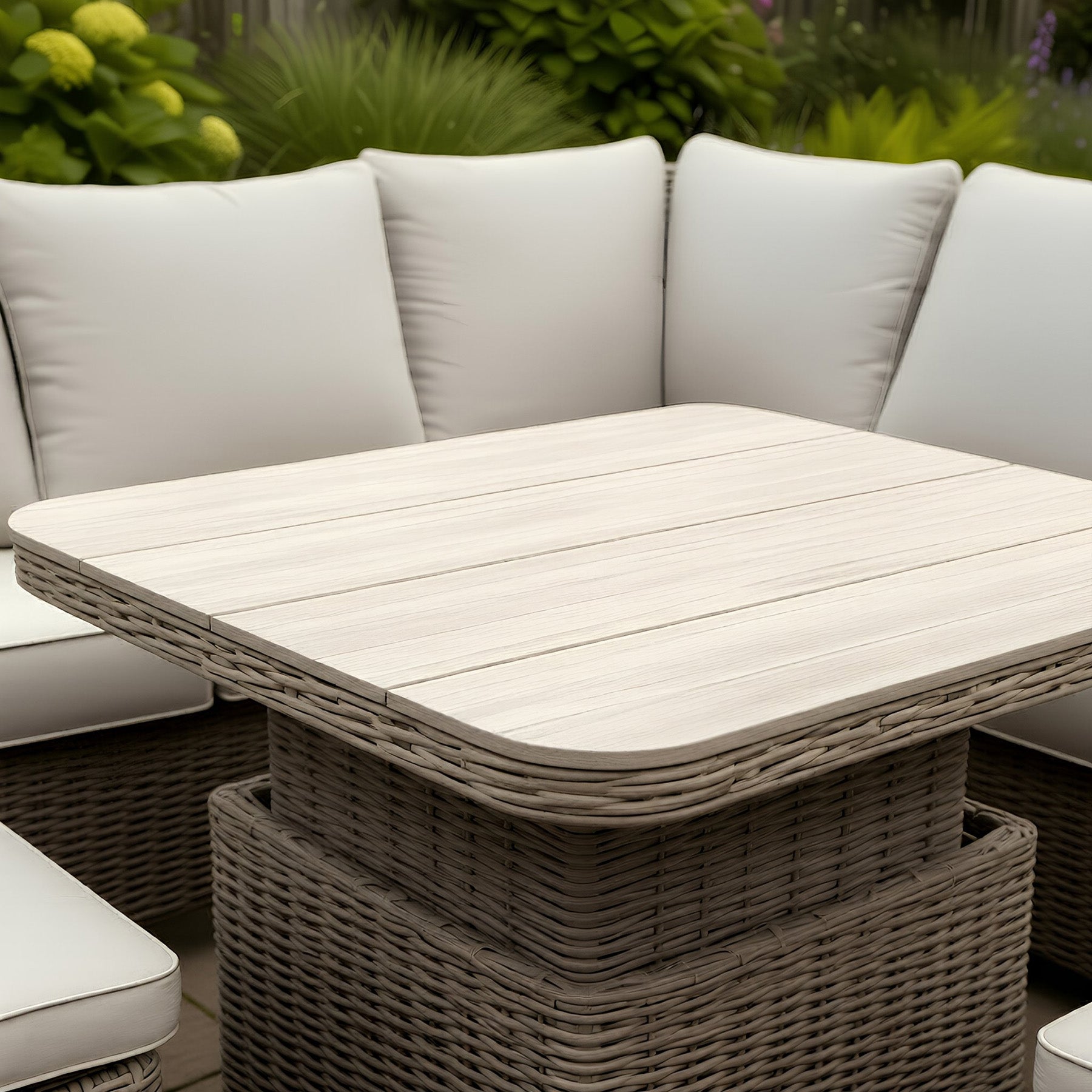 Designed for outdoor living, the Ashford set features weather-resistant materials that withstand sun, rain, and everyday use, making it an ideal choice for all-season garden furniture. The set includes a spacious corner sofa and two stools with plush, comfortable cushions and a coordinating square table with a Polywood table top. The table is height-adjustable, allowing you to switch effortlessly between a coffee table and dining table height for maximum versatility in your outdoor space.