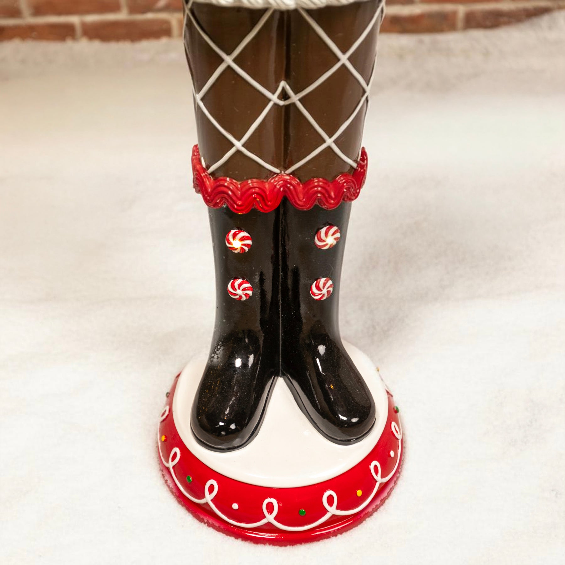 Dressed in a beautifully detailed outfit that mimics the look of iced gingerbread, this life size nutcracker features warm white LED lights nestled in his jacket and boots, creating a soft, magical glow that adds warmth to any room, entryway, or porch.