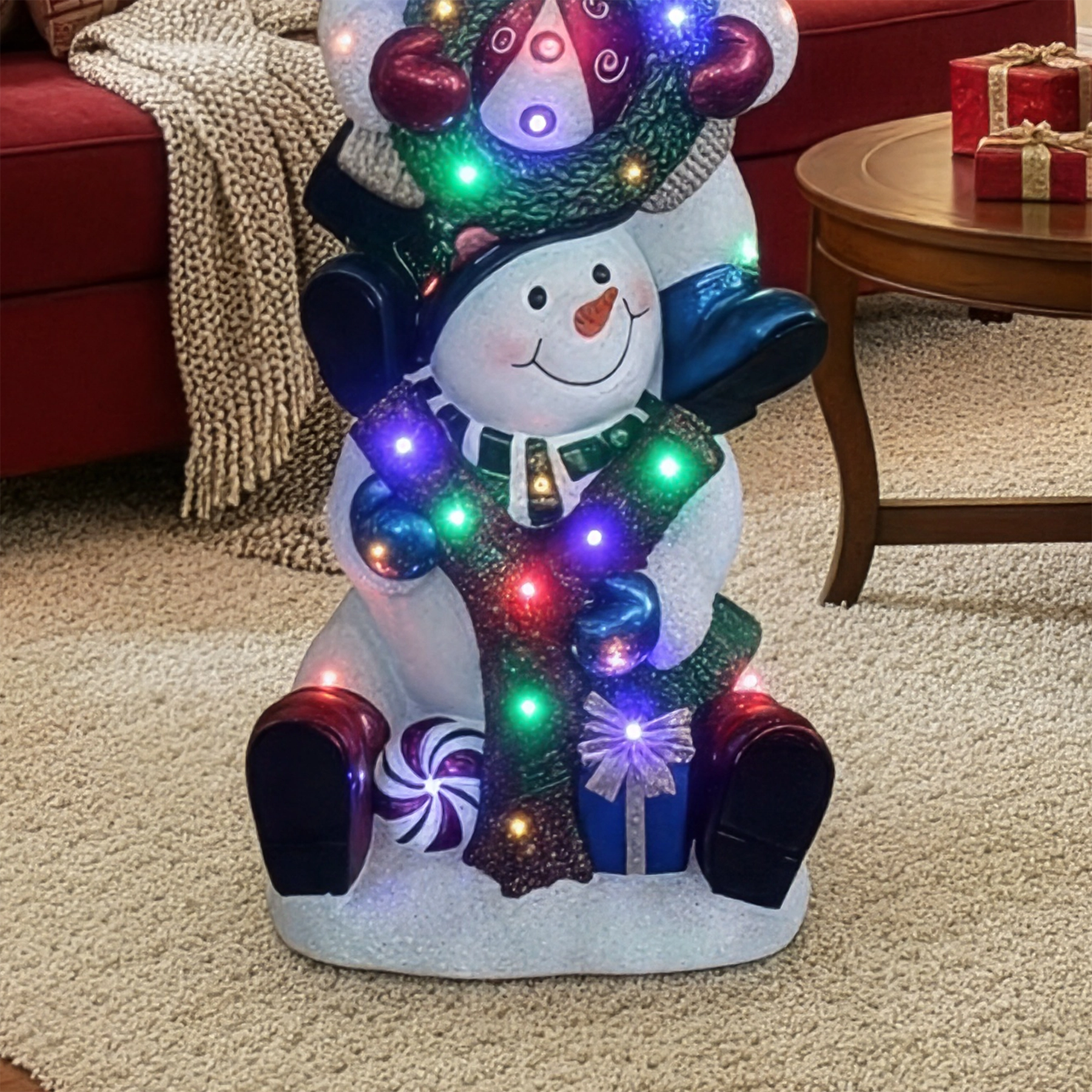 This adorable snowman trio features three stacked snowmen, each with a letter to spell out 'JOY', along with unique details like scarves, top hats, and carrot noses, all beautifully illuminated with 45 energy-efficient Multicoloured LED lights for a festive glow that will light up your covered outdoor area or living room.