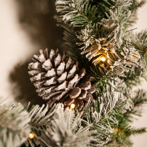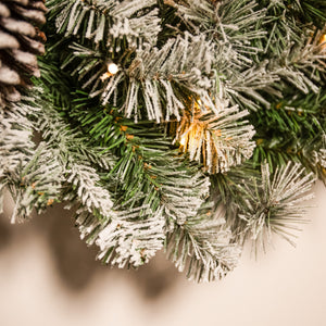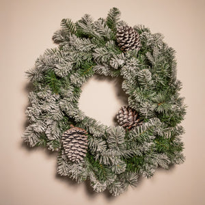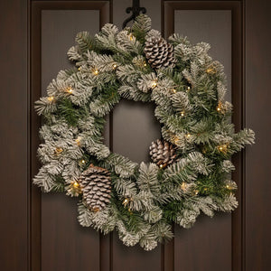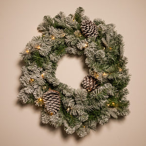 • Bring a timeless wintery charm to your home with The Christmas Centre Frosted Winterfold Fir 26in (66cm) Pre-Lit Christmas Wreath, a beautifully detailed decoration that captures the essence of the season. Measuring 66cm in diameter, this elegant wreath is crafted with lush fir-style foliage, delicately frosted to create the appearance of freshly fallen snow. Natural pine cones are scattered throughout the design, adding texture and authenticity, while the subtle frosted finish enhances the rustic, woodland look.