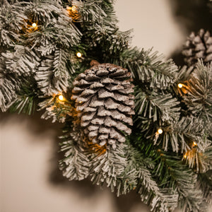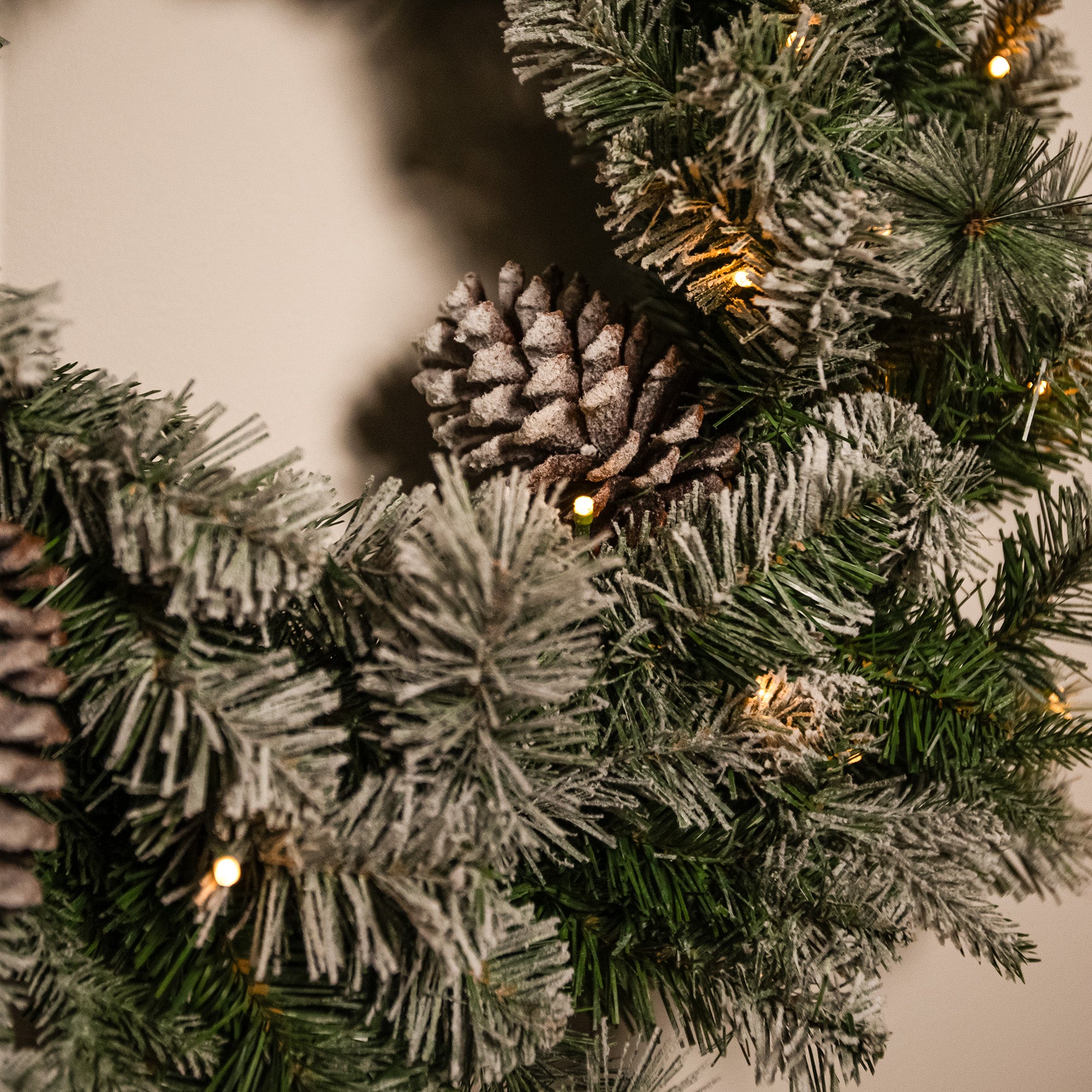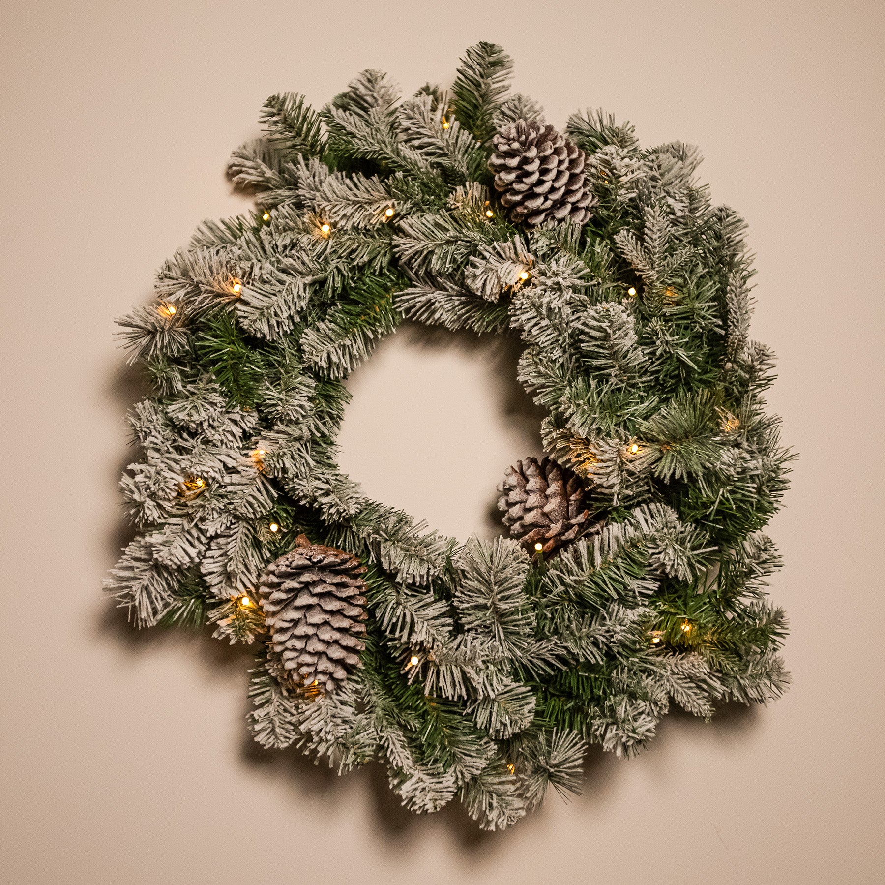 Illuminated with 50 warm white micro LED lights, the wreath glows with a soft, inviting radiance that highlights the snowy greenery and pine cone accents. Powered by 6x AA batteries, it can be placed with ease anywhere in your home, without the need for plug sockets or messy cables. With eight different lighting functions to choose from, you can create the perfect festive mood, whether you prefer a steady, calming glow or a sparkling twinkle.