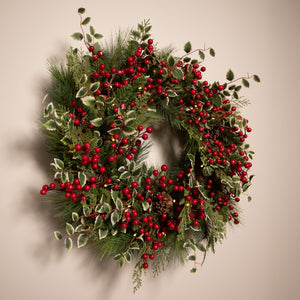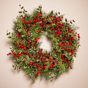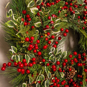• Celebrate the season with The Christmas Centre Hollyberry 26in (66cm) Pre-Lit Christmas Wreath, a festive decoration that captures the timeless beauty of traditional Christmas greenery. Measuring 66cm in diameter, this charming wreath is crafted from lush, full foliage and accented with clusters of vibrant red berries that add a joyful splash of colour and a classic festive touch. Its natural look makes it a versatile piece, perfect for complementing both traditional and contemporary Christmas decor.