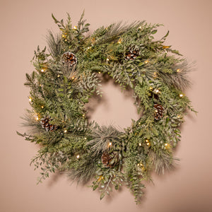 Measuring 66cm, the wreath is perfectly sized to make a statement whether hung on your front door, styled above a fireplace, or used as part of a larger seasonal display. Intertwined throughout the foliage are 50 warm white LED lights, delicately illuminating the wreath with a soft, golden glow. Battery powered with 6x AA batteries, it offers complete flexibility, allowing you to display it in any indoor or covered outdoor setting without the restriction of nearby sockets.