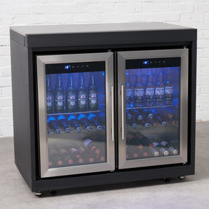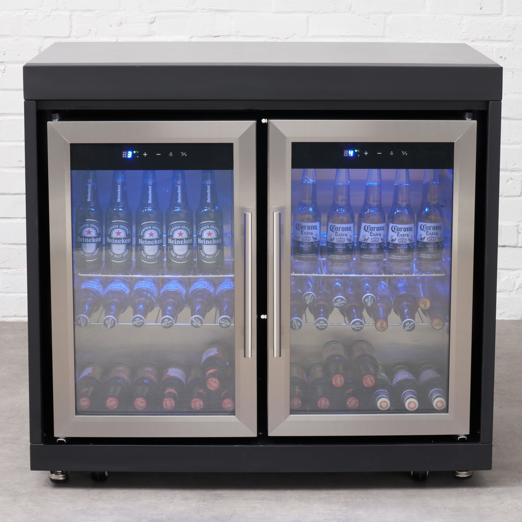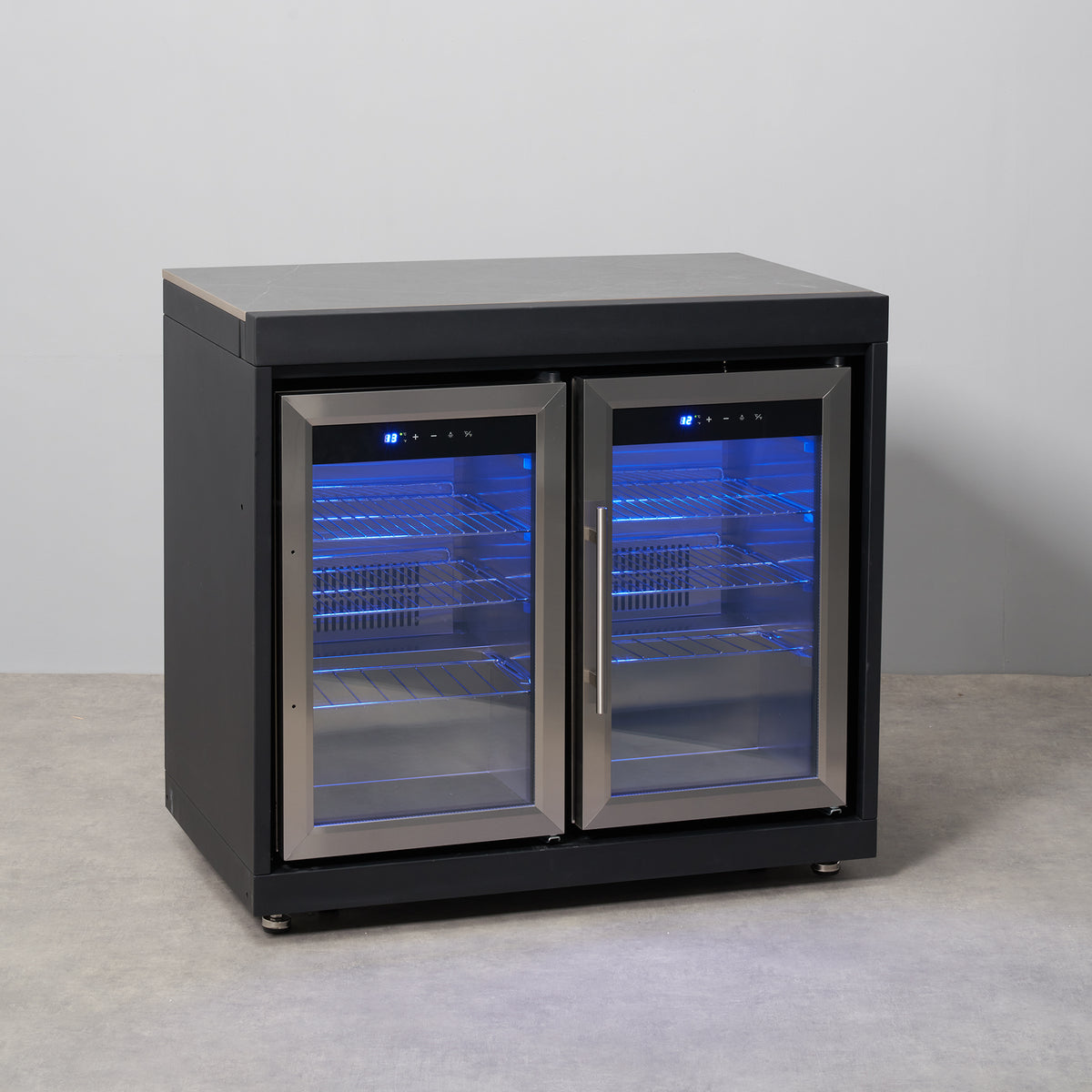 • The Draco Grills Fusion Outdoor Kitchen Black Double Fridge Cabinet with Sintered Stone Top features a sleek, modern design. It can be used as a free-standing unit or as part of a large outdoor cooking space.