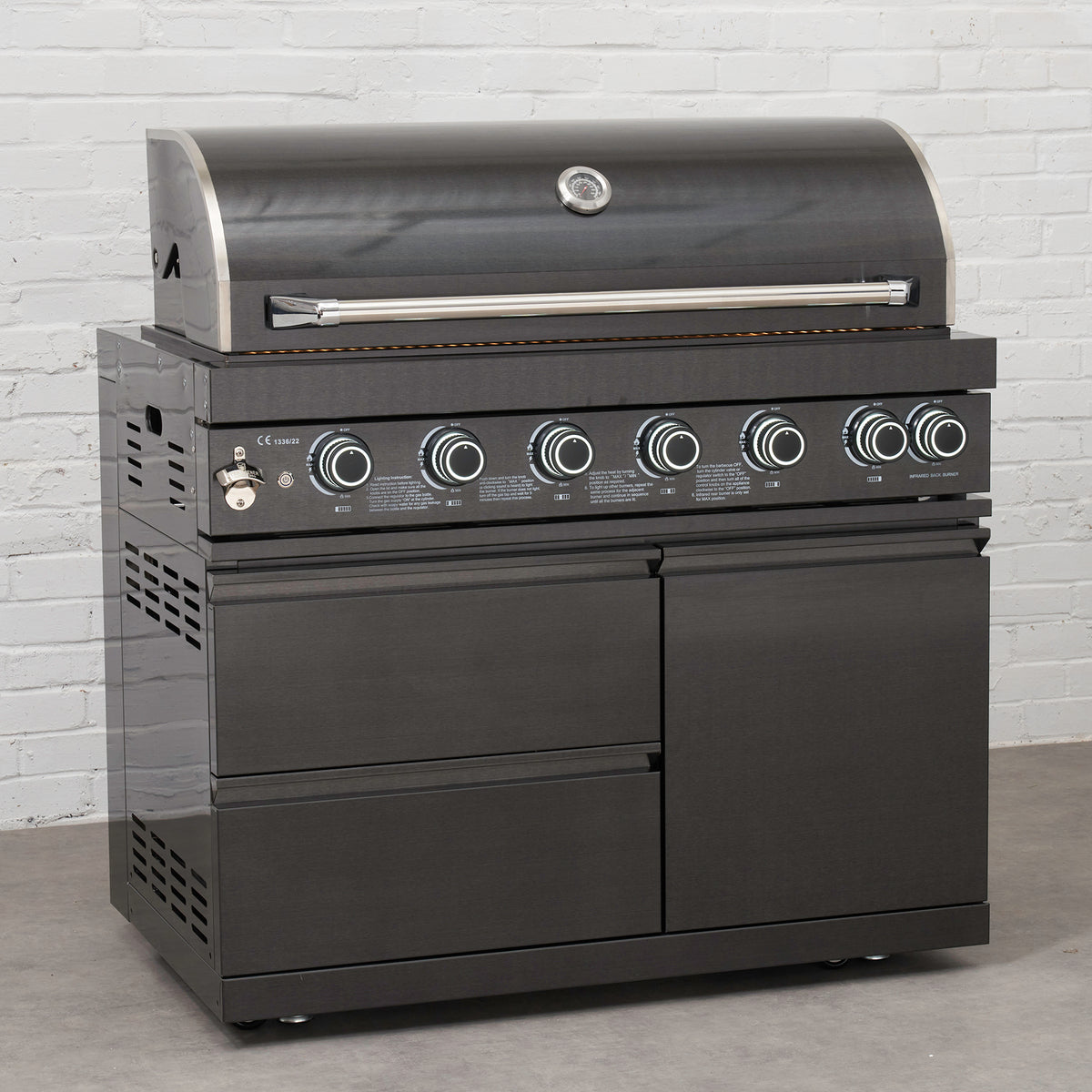 The Nero 6 Burner Barbecue comprises of a double skinned black stainless steel dome hood with 'cool to touch' technology, cast stainless steel "Power" burners give a consistent flame from front to back, providing even and efficient heat distribution, teamed with a ceramic infrared rear burner, for perfect grilling.