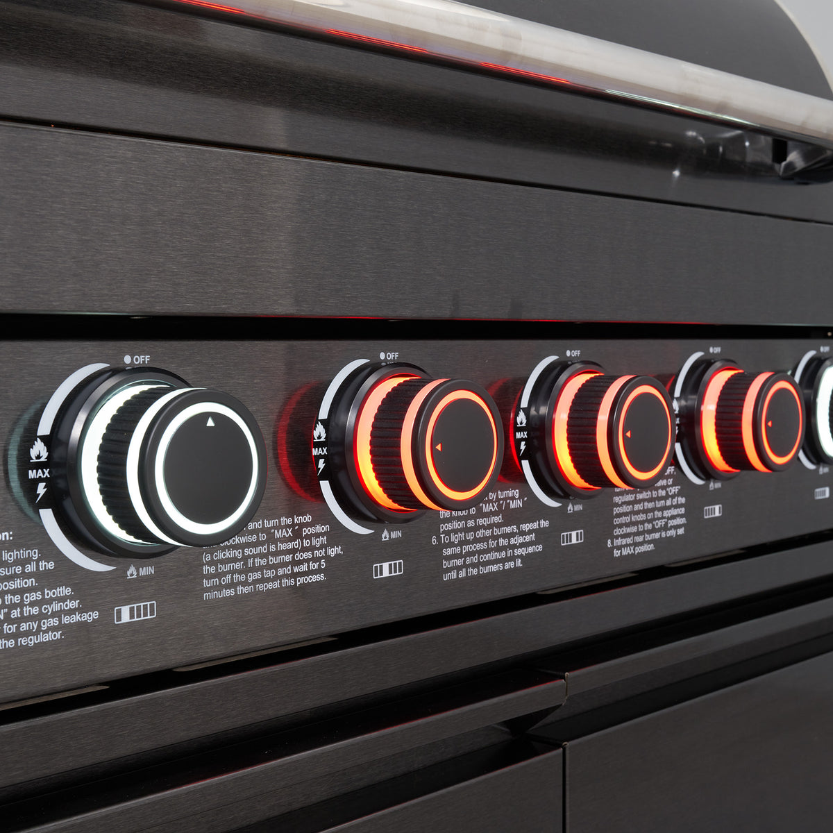The burner controls have individual back light colour changing from white to red, indicating which burners are in use. The whole barbecue is constructed from high corrosion resistant solid 304 grade stainless to the burner box and framework.