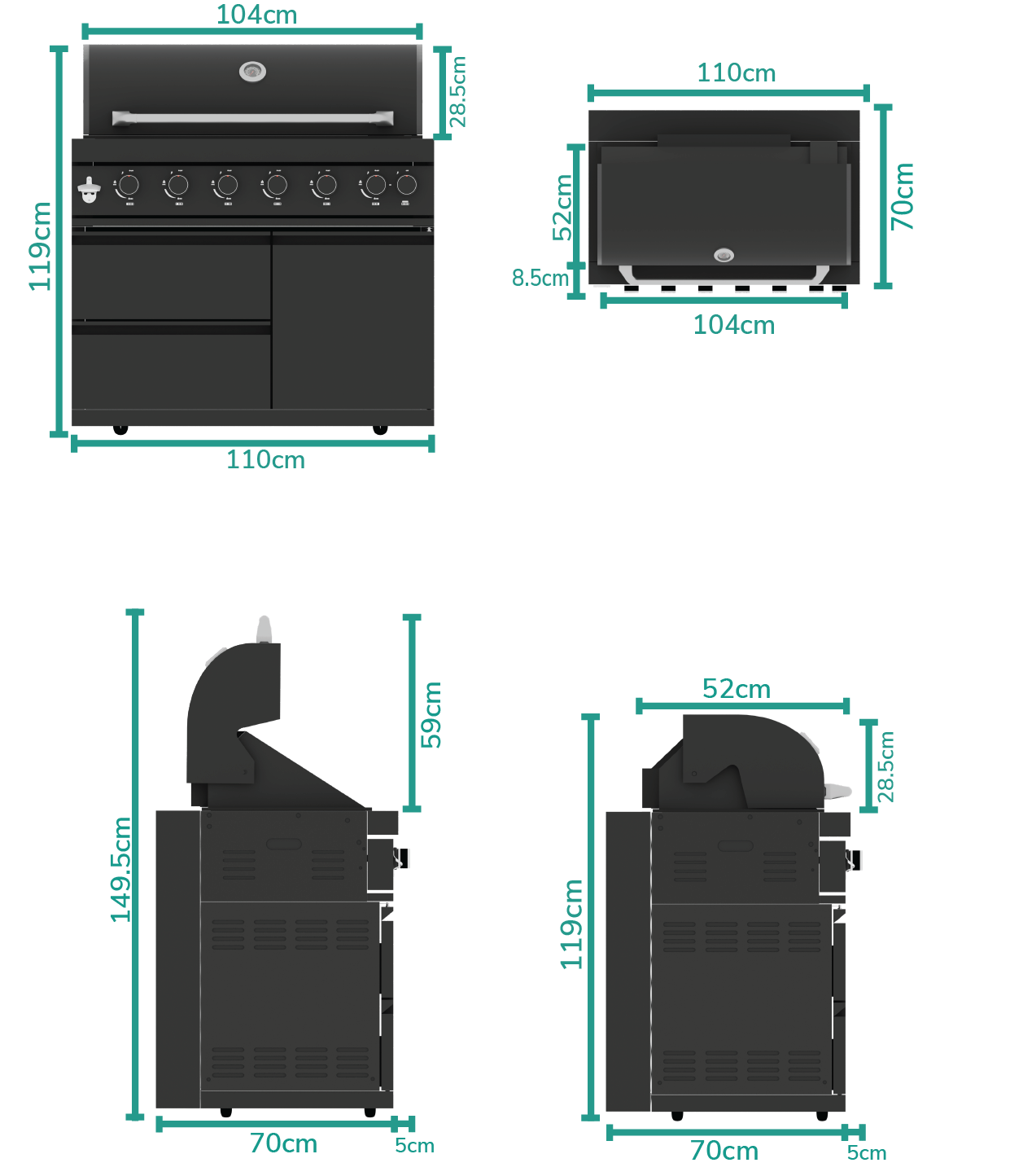 • Nero 6 Burner BBQ Dimensions: 119cm (H) x 110cm (W) x 73.5cm (D)