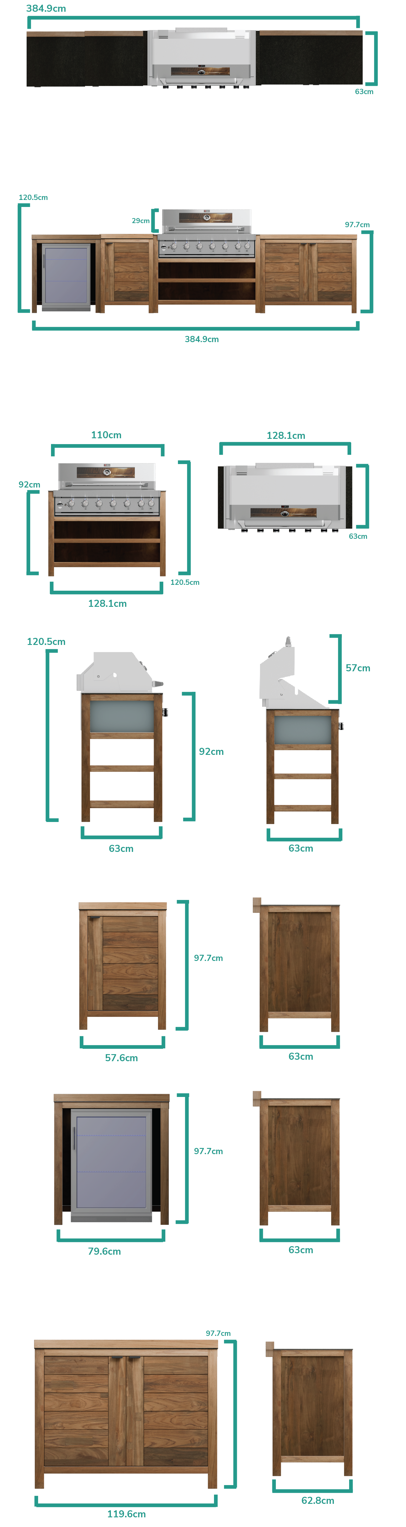 • This pre-configured Draco Grills Teak Outdoor Kitchen does it all! It contains a 6 burner BBQ, single and double cupboards, and a single fridge (the BBQ and fridge also come with housing units). The rustic mix of reclaimed Teak and Ceramic worktops will make this outdoor cooking space look fantastic in your garden and has everything you will need to assist in cooking & hosting for medium to large gatherings.