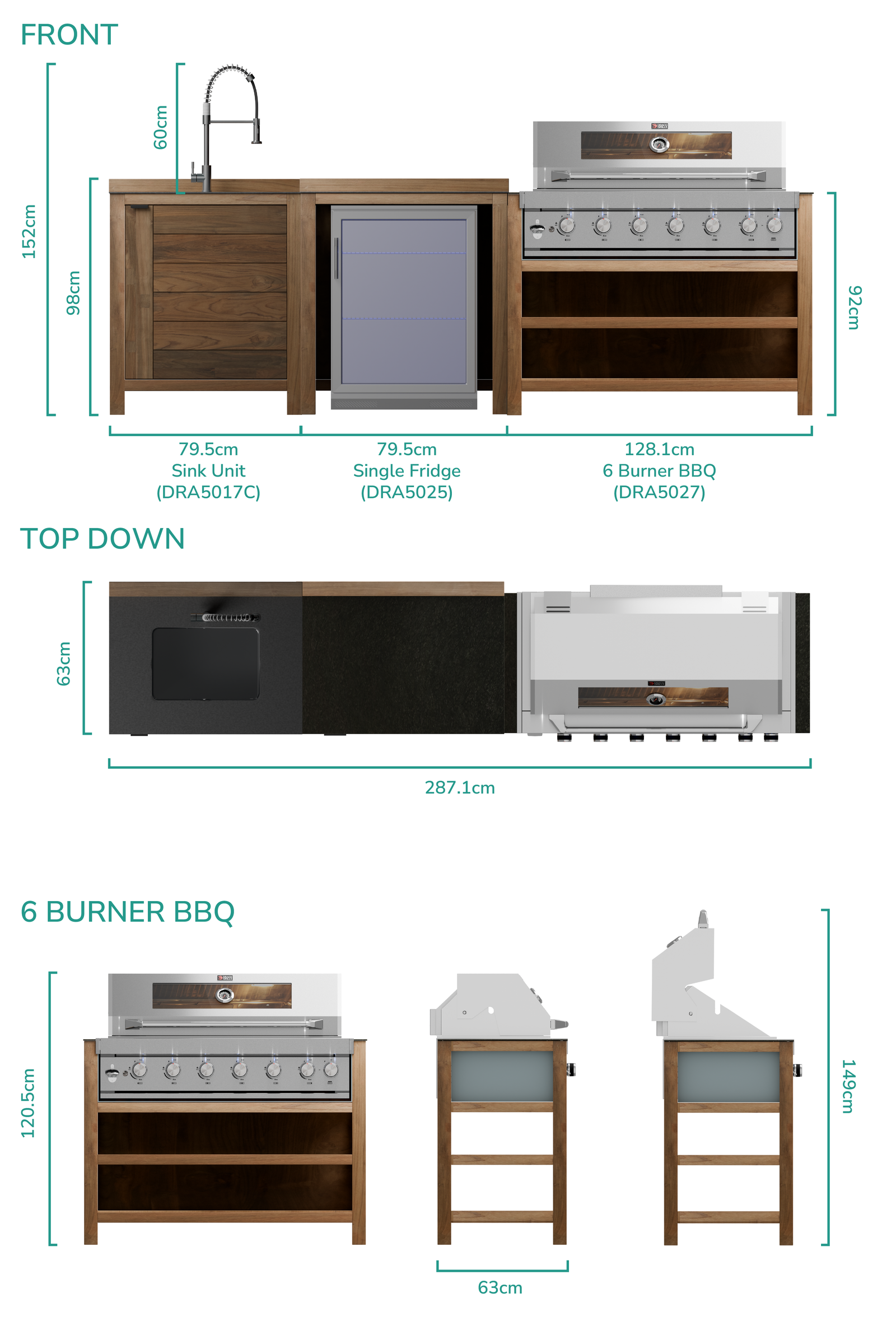 • This pre-configured Draco Grills Teak Outdoor Kitchen has everything! It contains a sink, single fridge, and 6 burner BBQ with housing unit. The natural combination of reclaimed Teak and ceramic worktops suit any garden and provides everything you need to cook and entertain small to medium-sized groups of people.