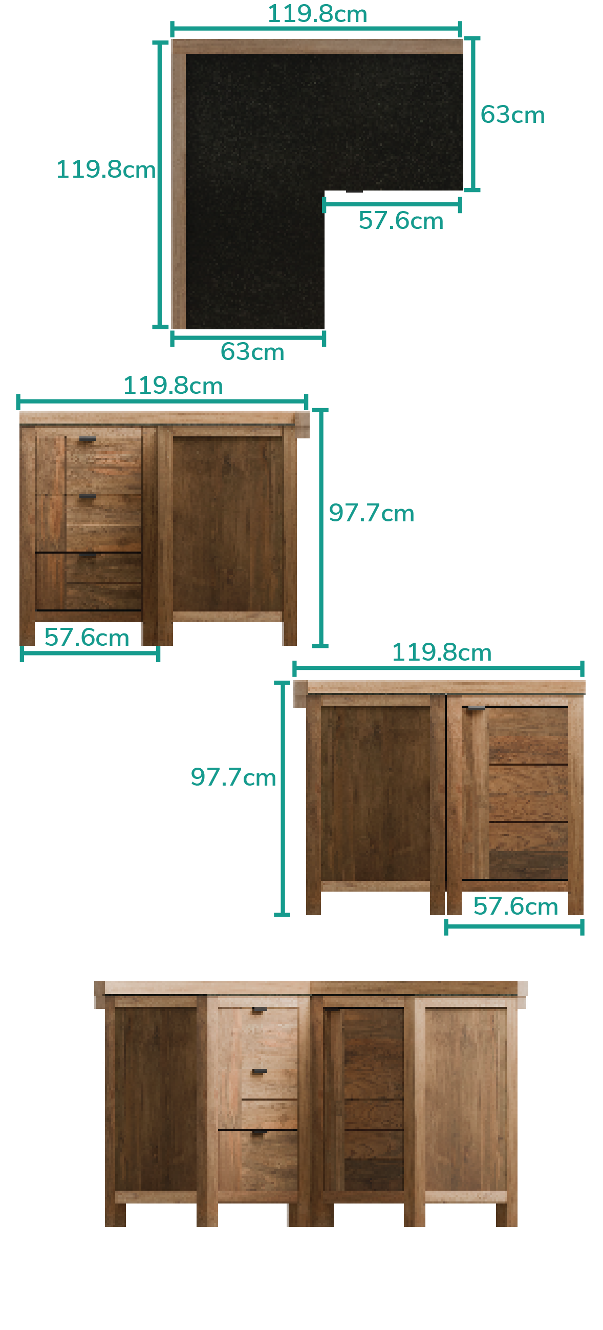 This corner unit has two storage sections: the right side contains 1 shelf inside and the left side has three drawers. It is enclosed within a soft closing Teak Panel door, allowing both small and large items to be kept inside (e.g. cooking utensils, cutlery or crockery). All within a sustainable and solid Reclaimed Teak frame topped with a stunning Dark Stone Ceramic work surface.