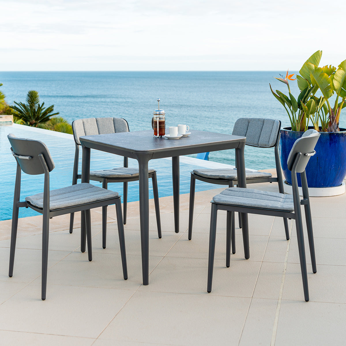 Alexander Rose's Rimini Collection stands out for two different reasons. First and foremost, the products are angular, modern, and sleek, lending an air of effortless sophistication to your outdoor space. Second, the collection is very durable and resistant to even the harshest weather. The pieces are made of recyclable powder-coated aluminium in a textured matte grey finish.