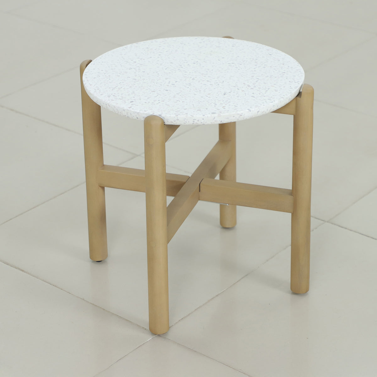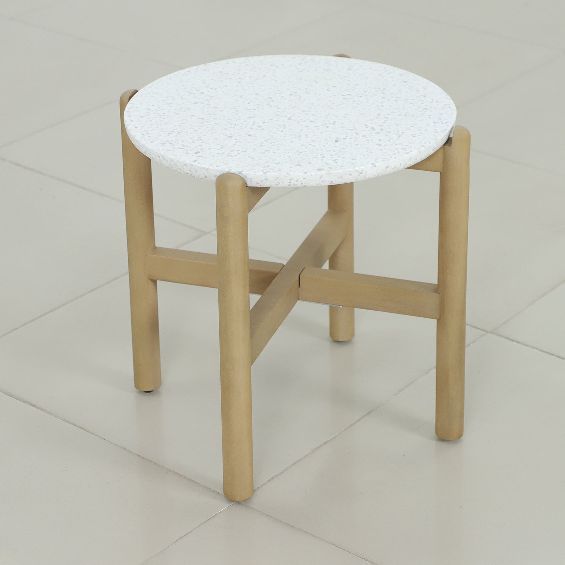 • 2 x Light teak Acacia hardwood round coffee tables with terrazzo ceramic tops