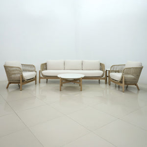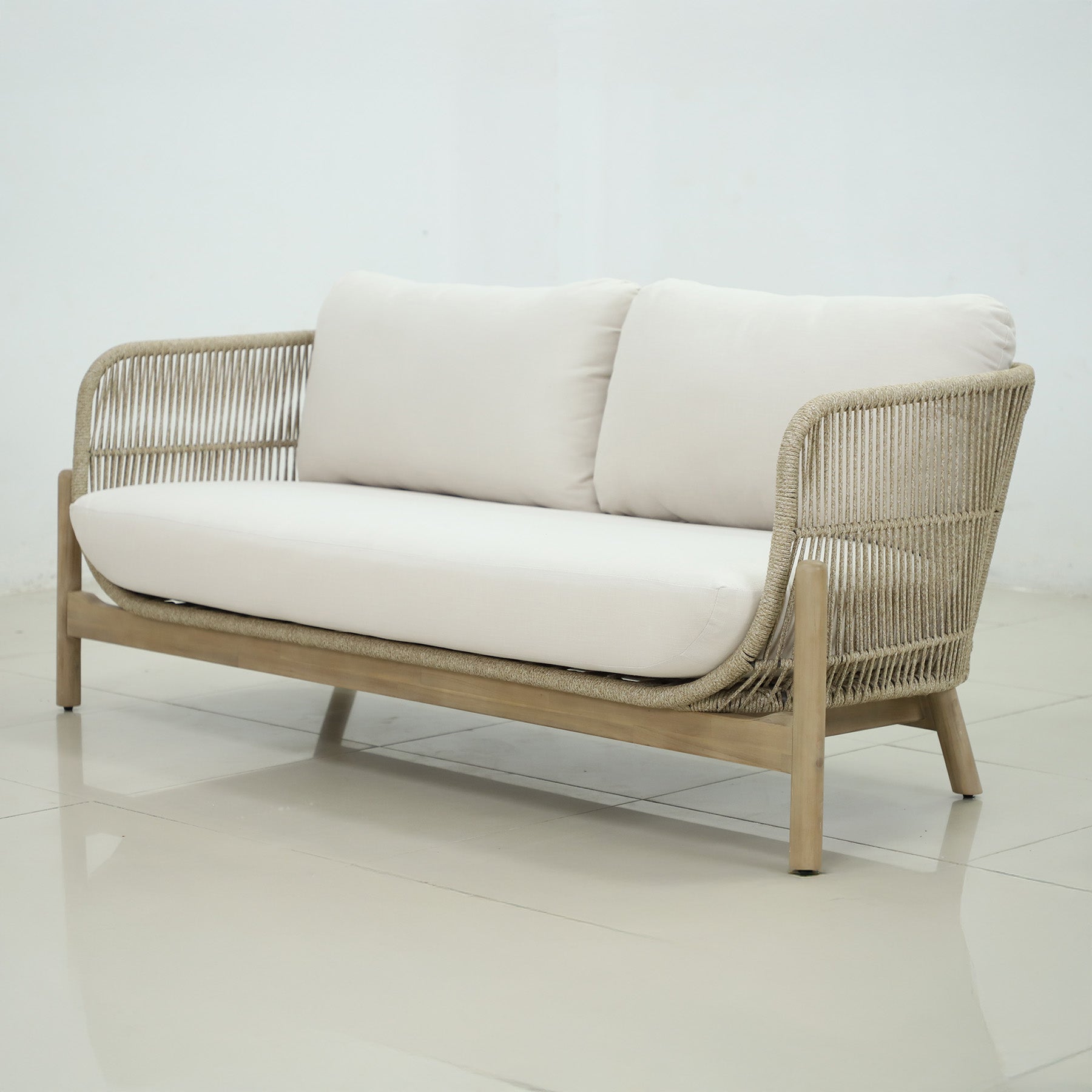 • 1 x Light teak Acacia hardwood and rope 3 seat sofa with linen beige cushions