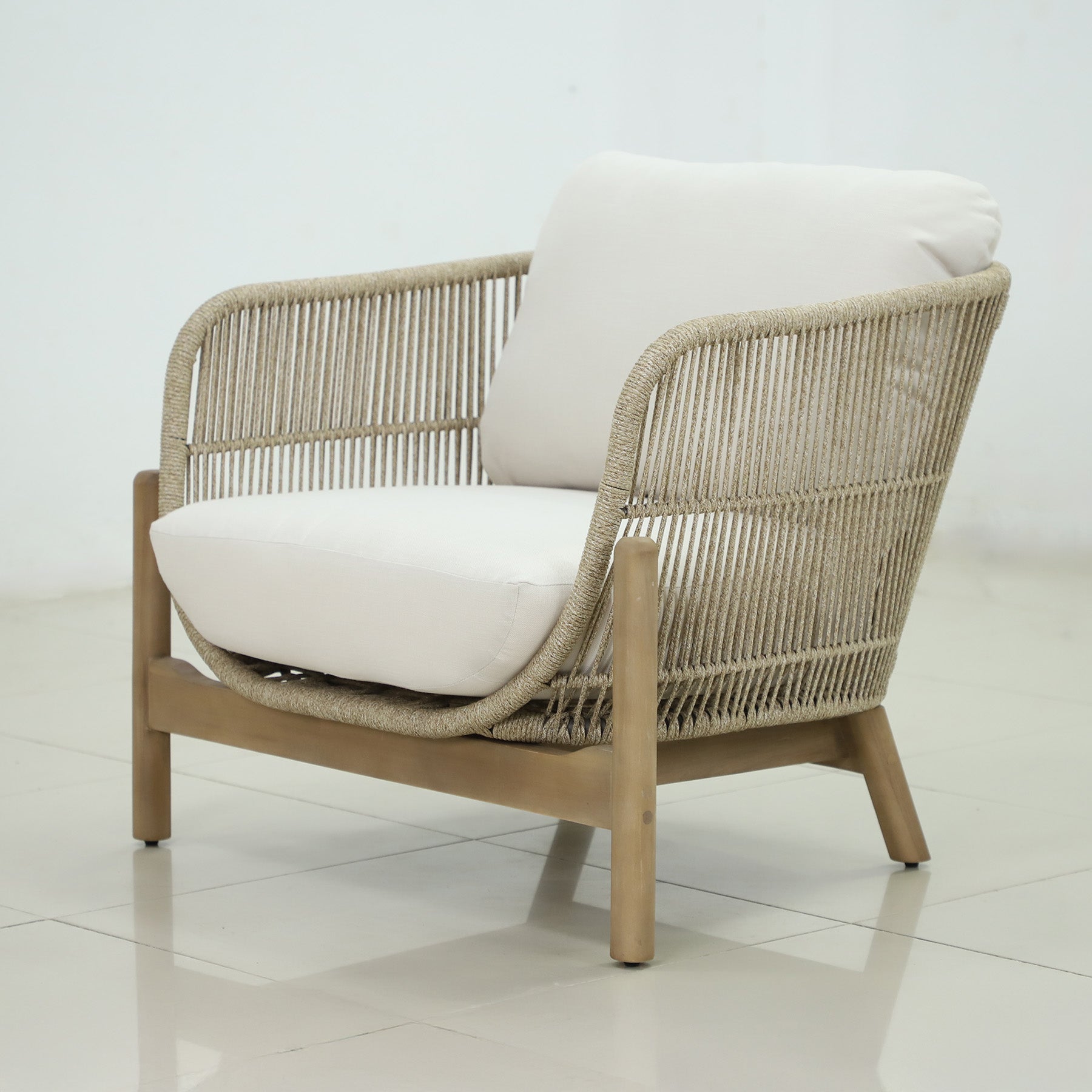 • 2 x Light teak Acacia hard wood and rope lounge armchairs with linen beige cushions