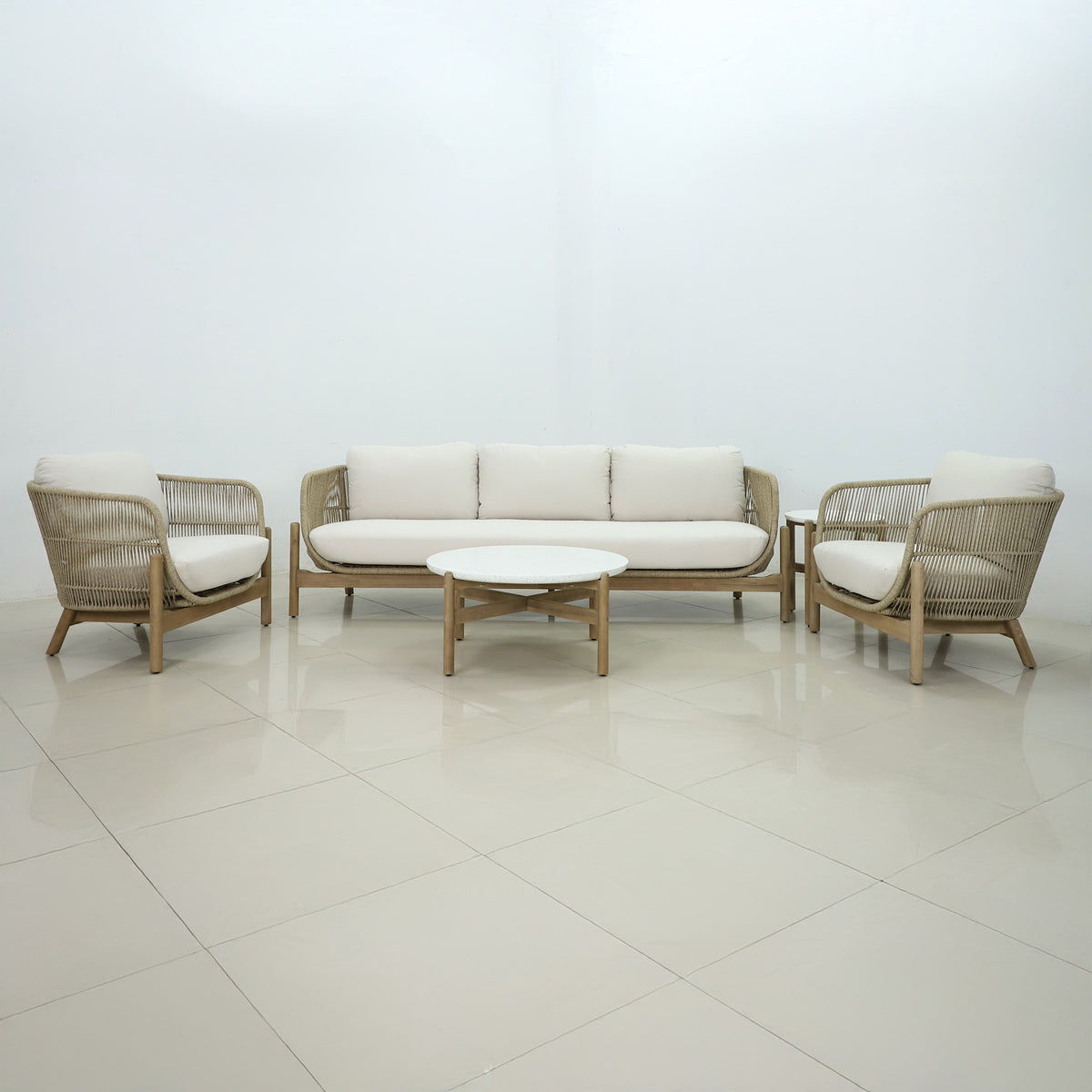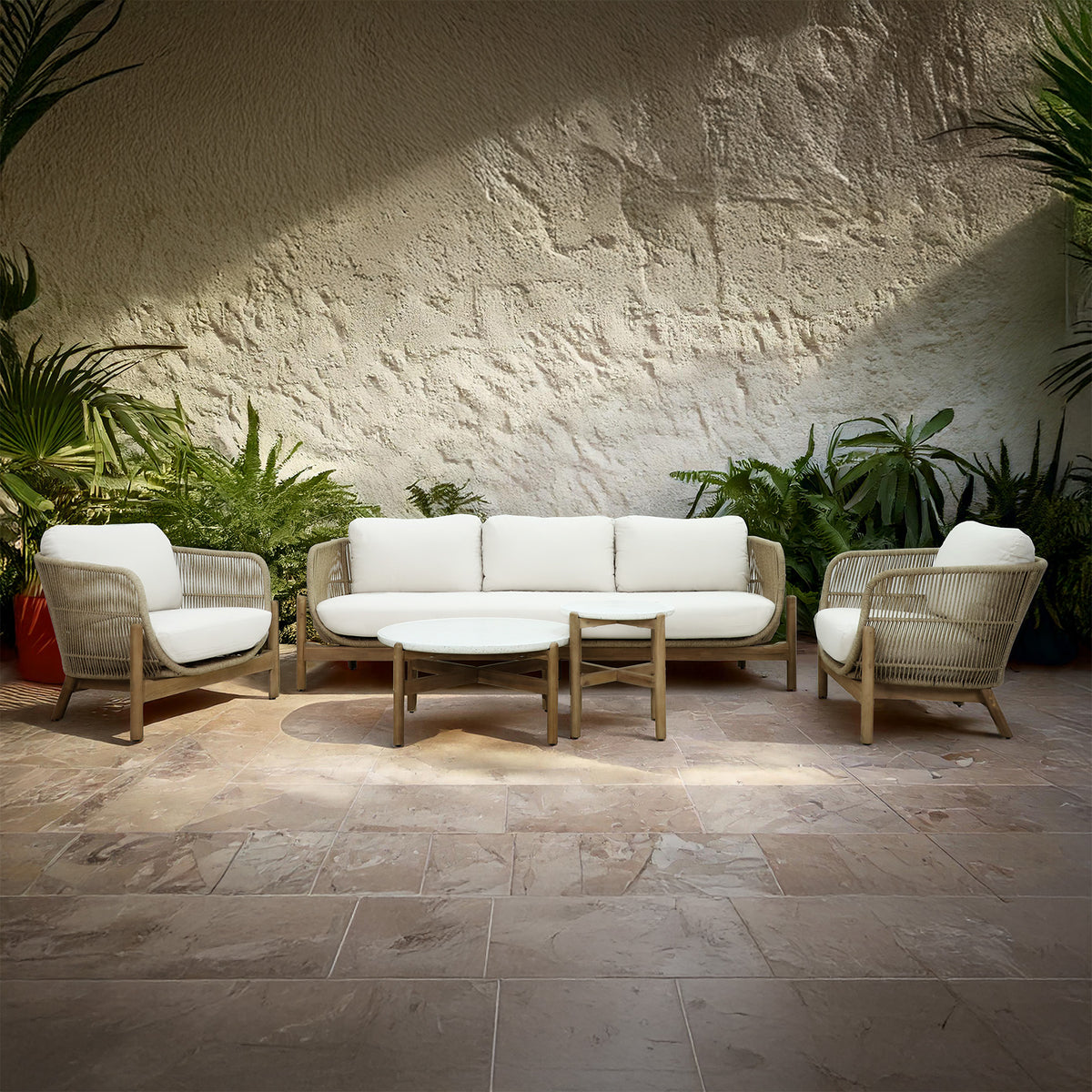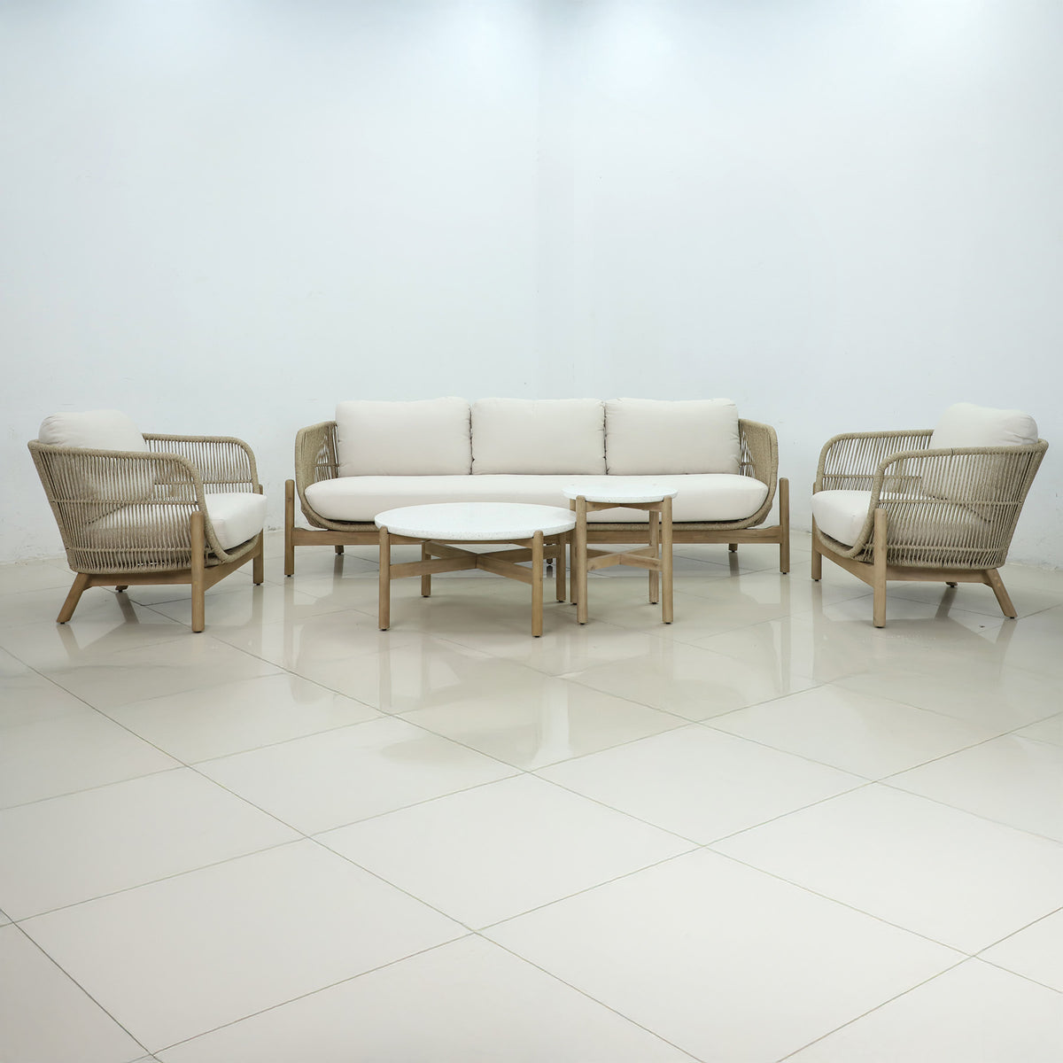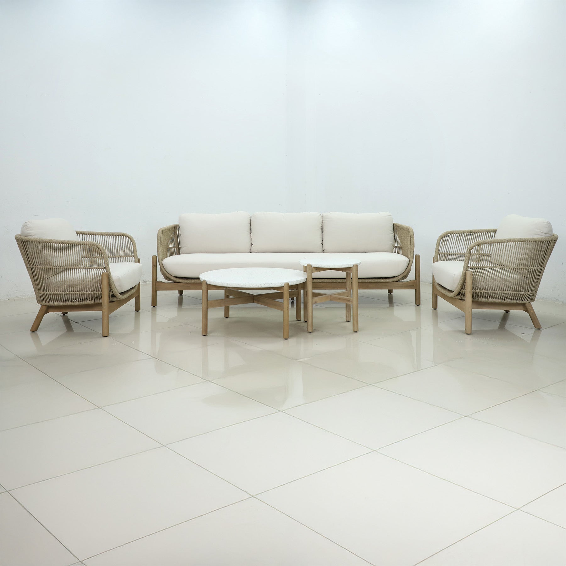 This set includes not one, but two sleek coffee tables, offering plenty of space for drinks, snacks, or decorative items, making it the perfect setting for both intimate conversations and larger gatherings. The combination of weather-resistant acacia wood and stylish rope accents ensures long-lasting durability, so you can enjoy your outdoor space year-round without worrying about wear and tear.