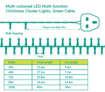 Multi-Coloured Multi-Function Christmas Cluster Lights with Green Cable 360, 480, 720, 960, 2000 LED