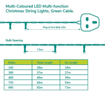 Multi-Coloured LED Multi-Function Christmas String Lights with Green Cable 240,360,480,720, 960 Bulbs