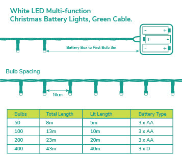 Bright White Battery Multi-Function Christmas String Lights with Green Cable 50,100,200,400 LEDs