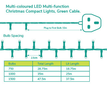 Multi-Coloured Multi-Function Christmas Compact LED Tree Lights with Green Cable 750,1000,1500