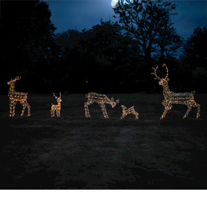 • Bring a touch of festive magic to your home this Christmas with the Pre-Lit Christmas Laser Ribbon Light-Up Reindeer Family. Ranging in size from 60cm to an impressive 140cm tall, this striking family is adorned with white LED lights, creating a shimmering, enchanting glow that will instantly elevate any festive display. Perfectly crafted for both indoor and outdoor settings, each reindeer comes with a 10-metre cable for flexible placement, though the transformers must be kept inside at all times.