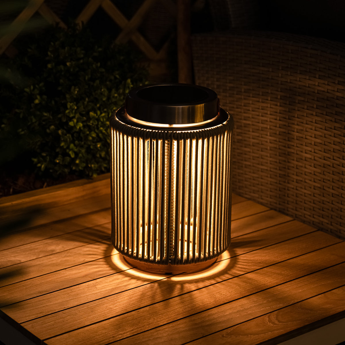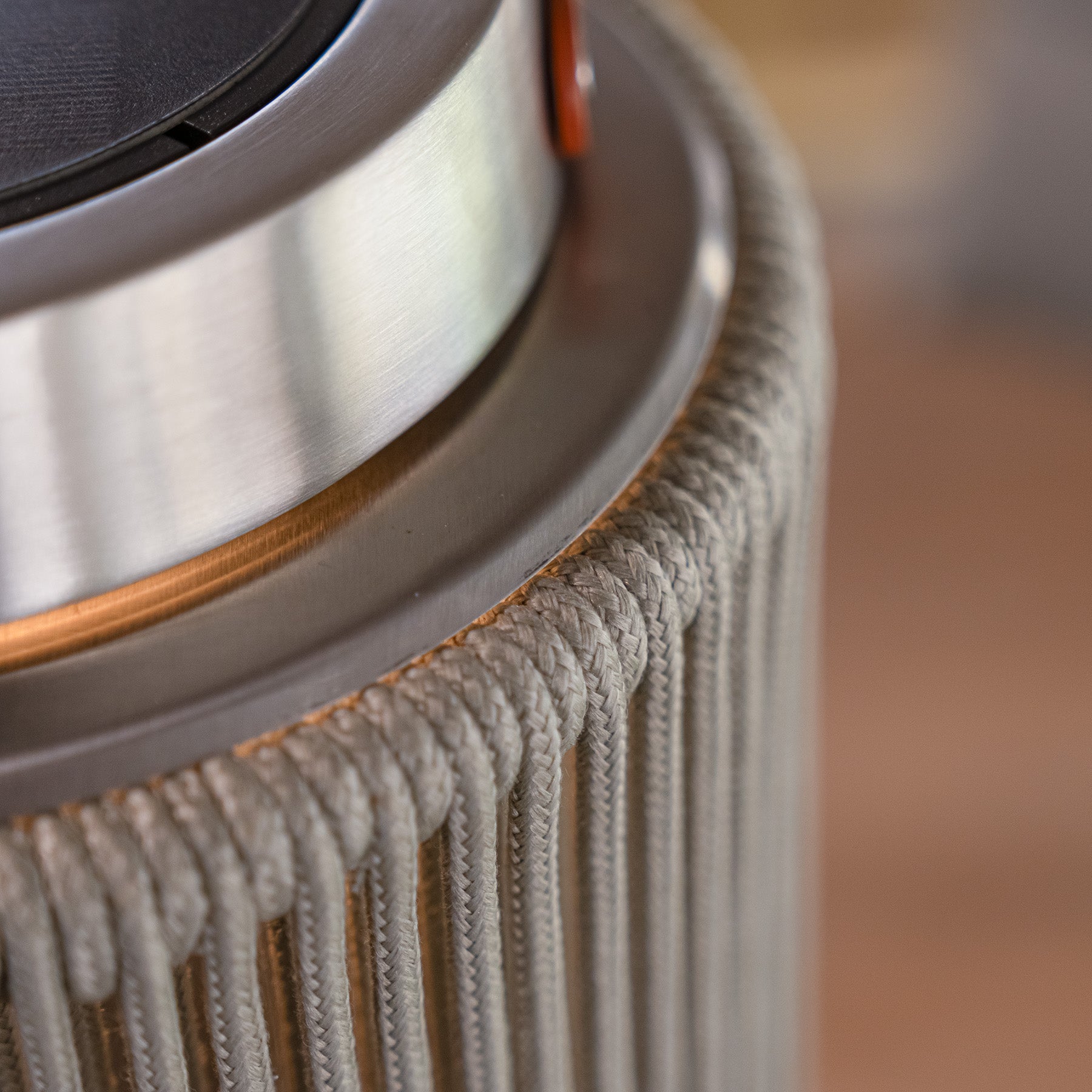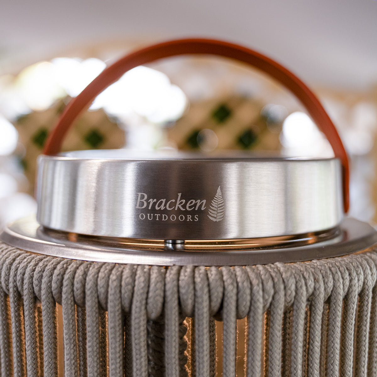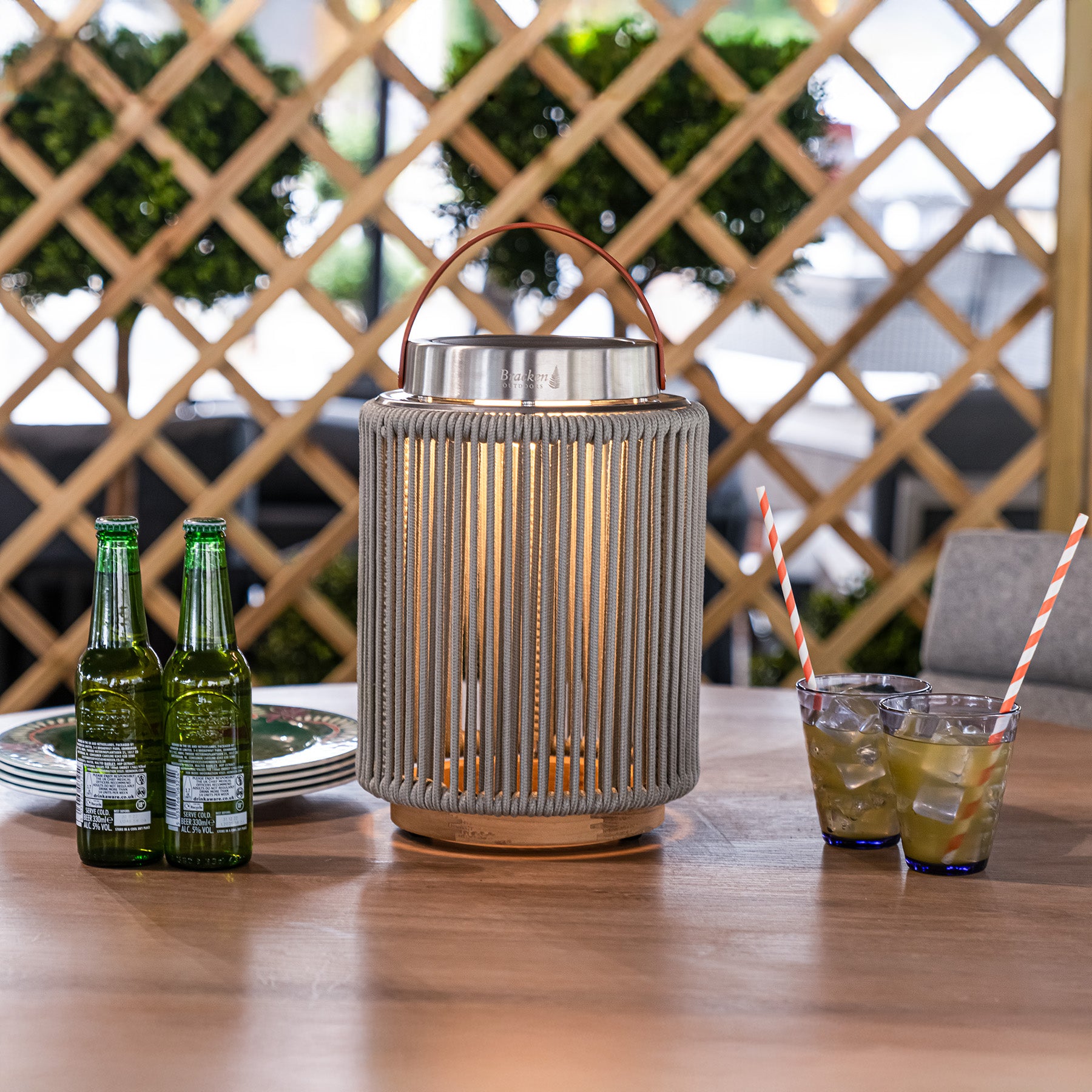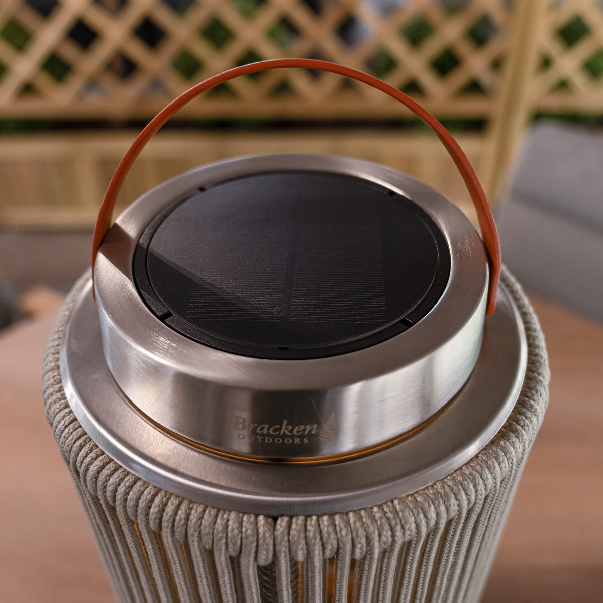 Brighten up your evenings outside with this small Bracken Outdoors Solar Powered Rope Garden Lantern! It is made from durable stainless steel with a modern textaline rope finish in light grey.