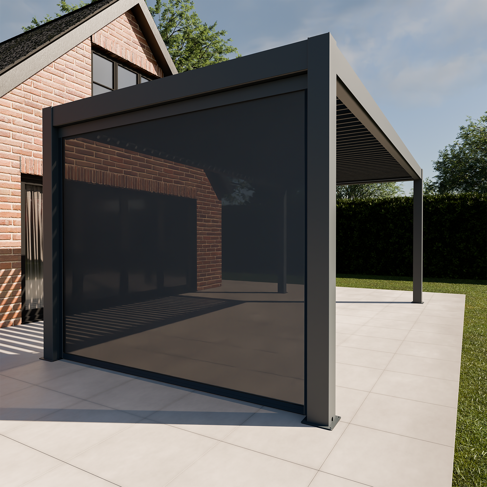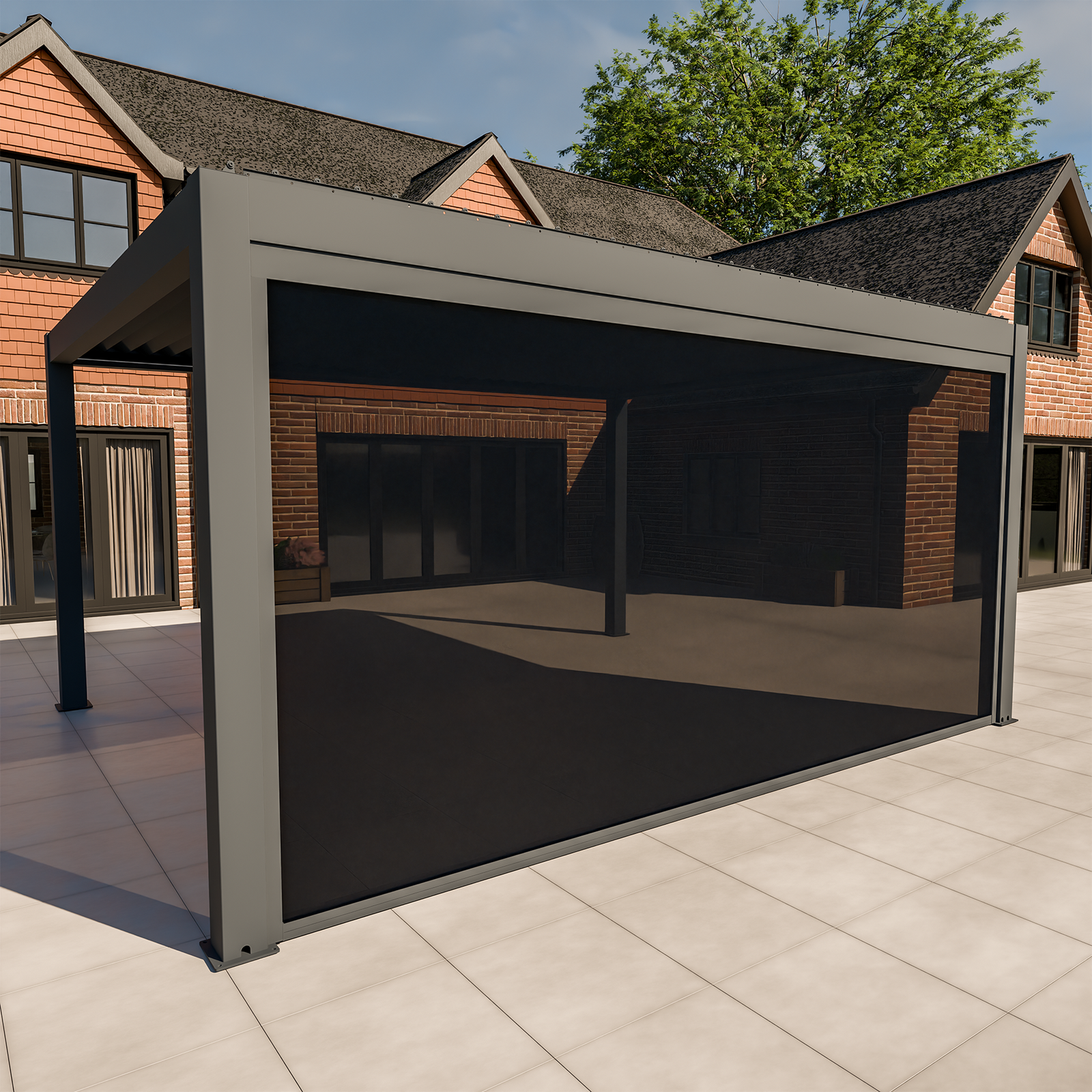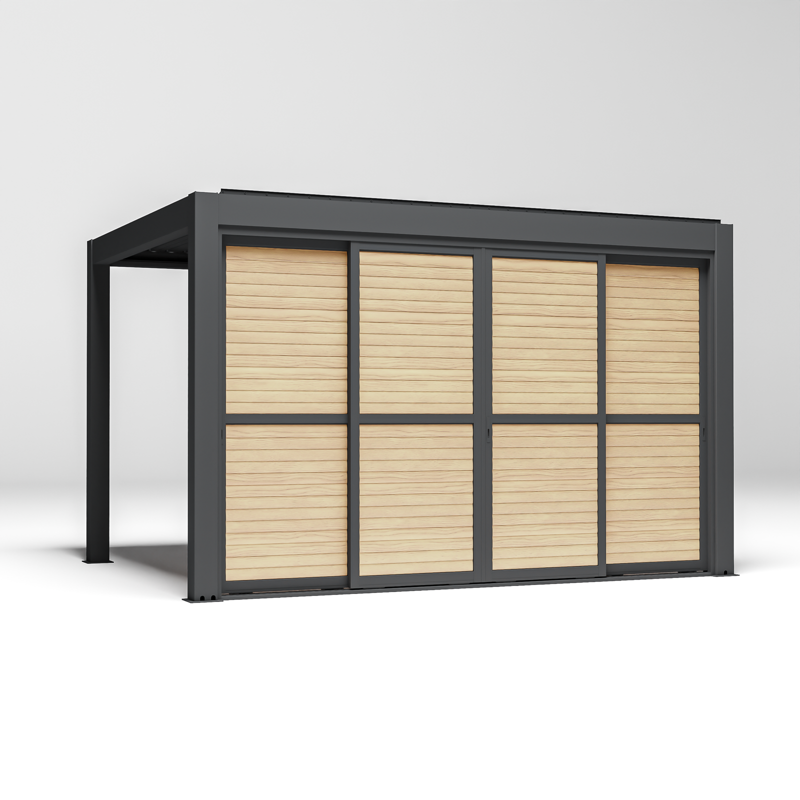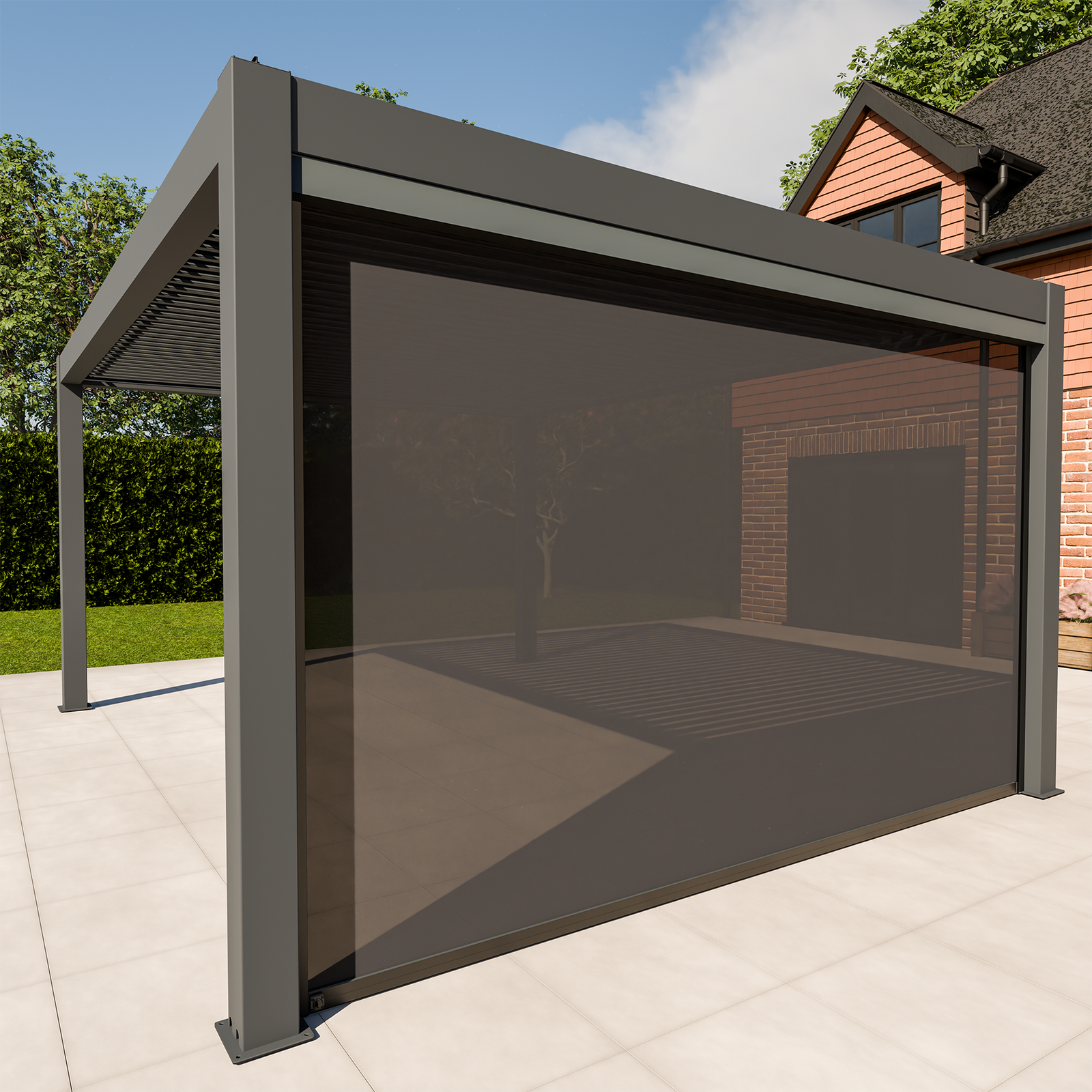 Full width blinds are available for the 3m amd 4m sides in anthracite and solid panels or louvre panels if you prefer something permanent, are available in anthracite or wood effect.
