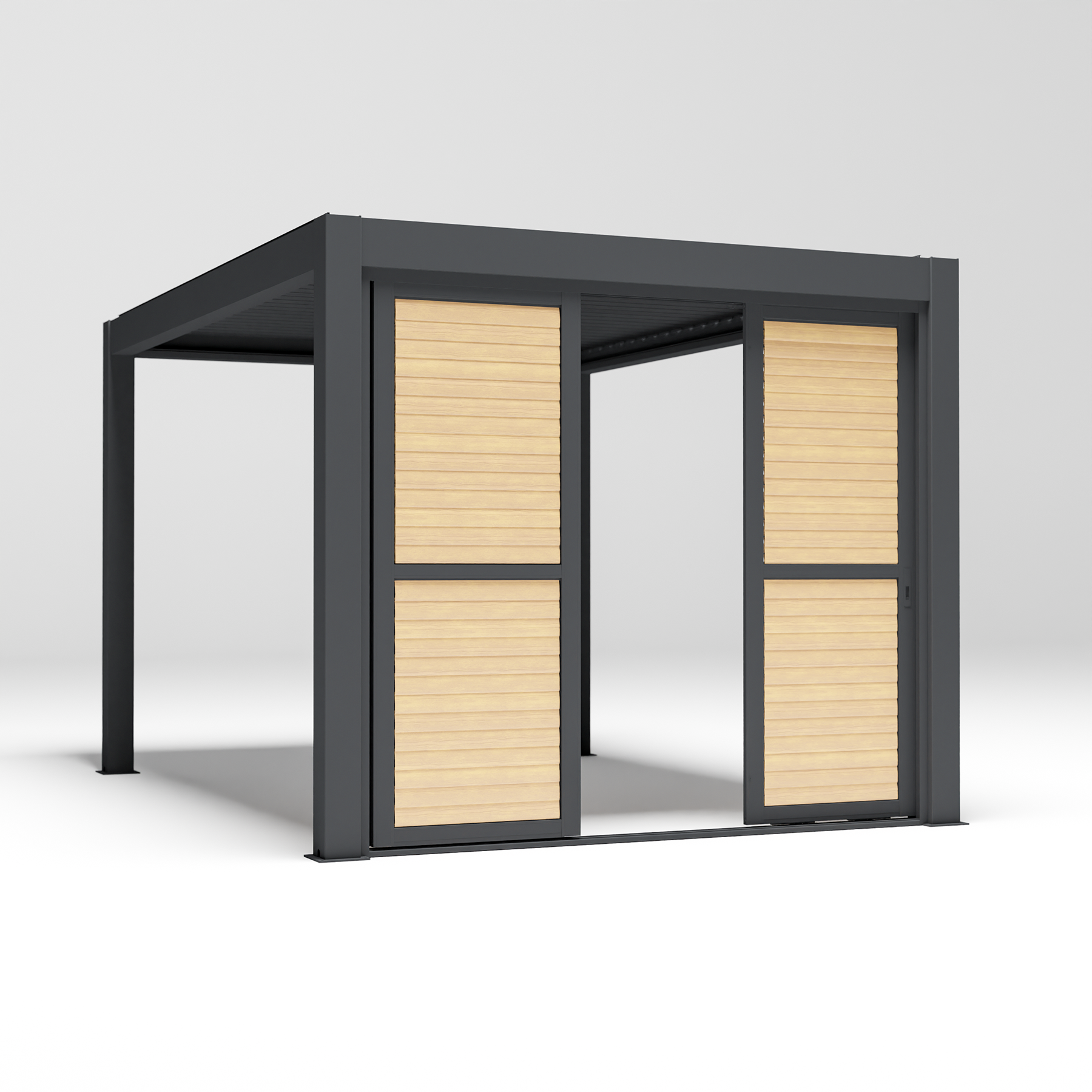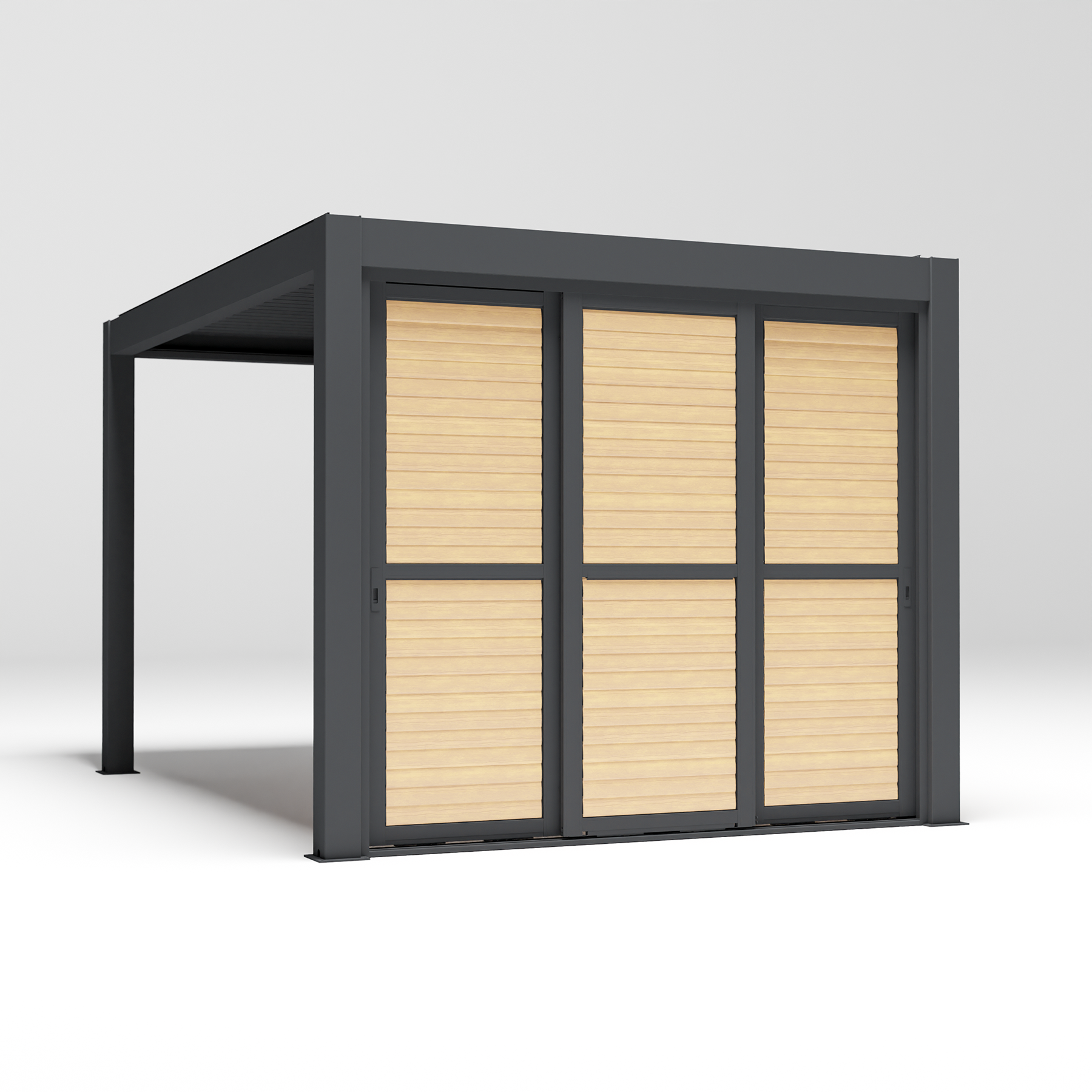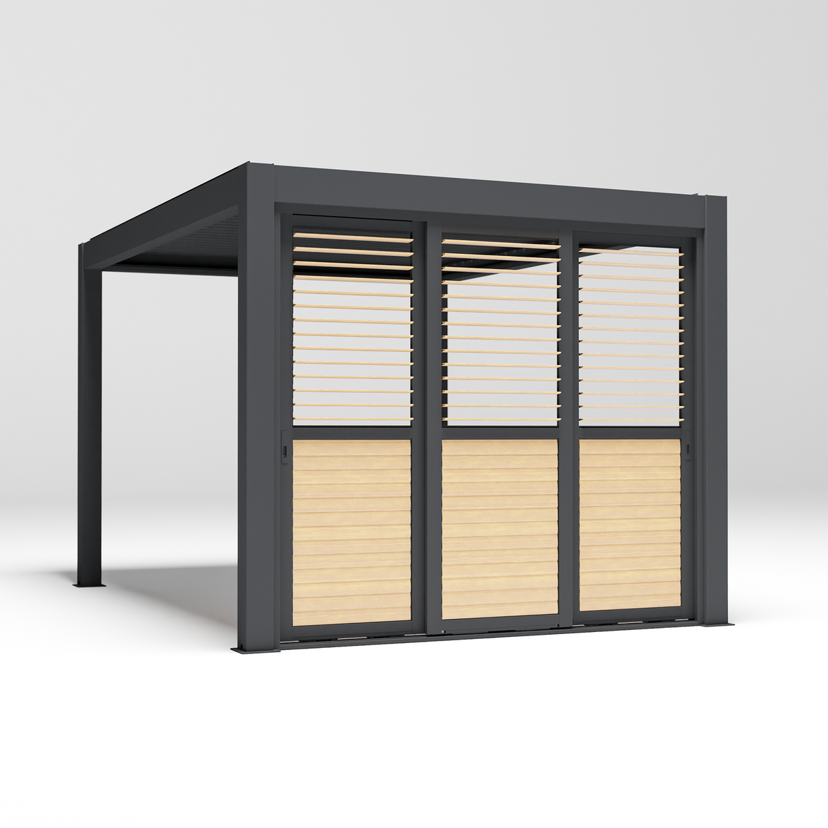 This premium kit features 3 sleek shutters in wood effect, each equipped with adjustable tilting louvers, allowing you to effortlessly control the amount of sunlight or shade in your pergola. The panels slide to give options of open, closed and partially closed.