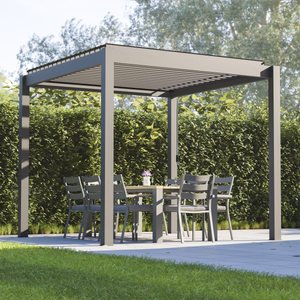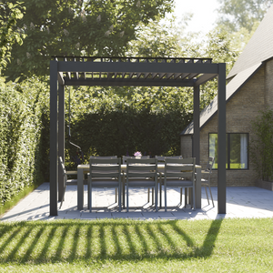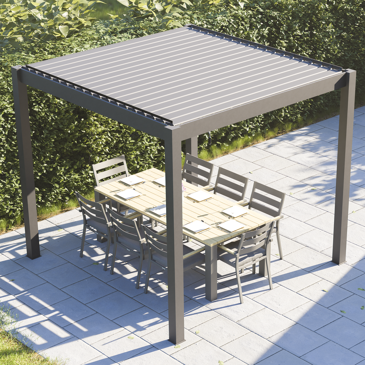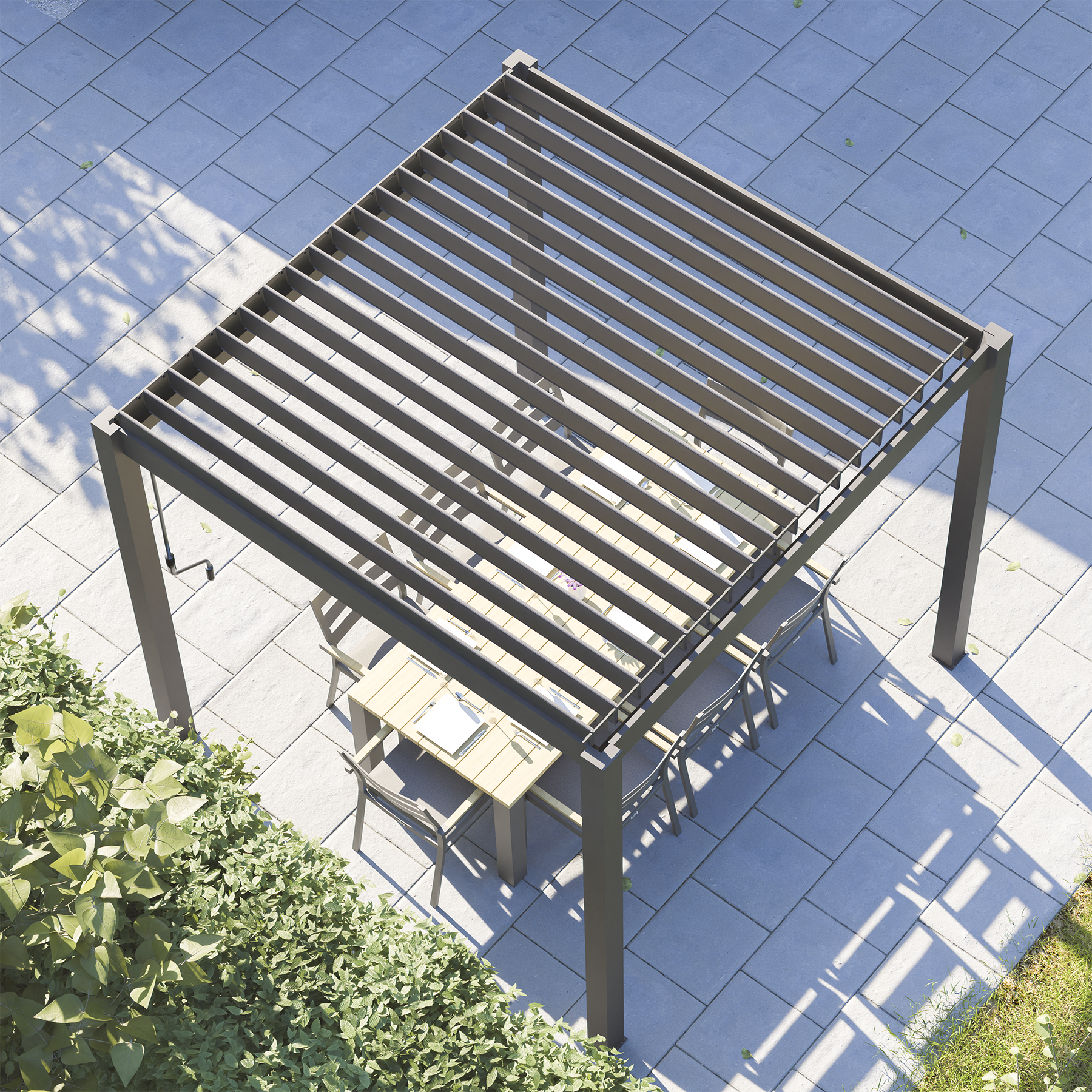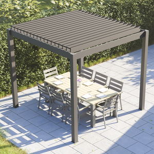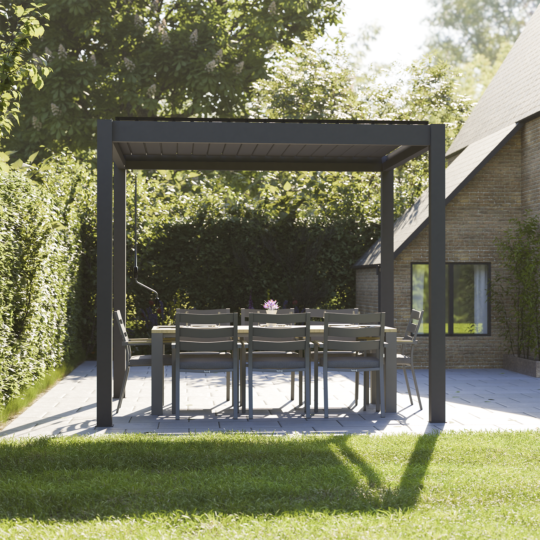 • The Bracken Outdoors Gemini 3m x 3m Anthracite Grey Square Garden Pergola is a high-quality aluminium pergola with round-cornered posts and double-layer inventive louvres to give your outdoor space perfect shade. It is built out of exceptional aluminium, ensuring its endurance and firmness. You can switch between the sun and shade modes thanks to the adjustable louvres.
