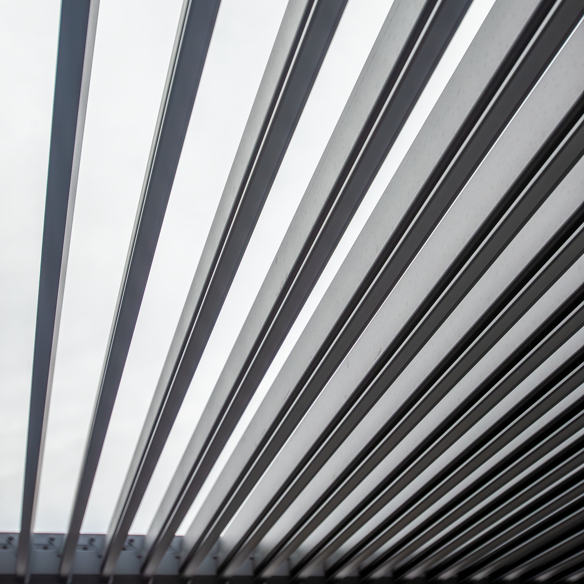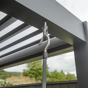 Rainwater is directed to the structure's posts via a hidden internal gutter system, providing a practical and efficient solution. The water flows into the post and drains at its base. The blade grooves allow the water to be diverted.