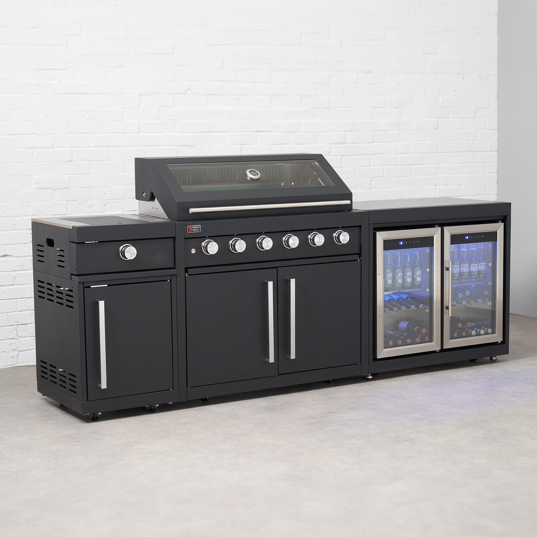Draco Grills Fusion 6 Burner Black Outdoor Kitchen with Modular Side Burner and Double Fridge