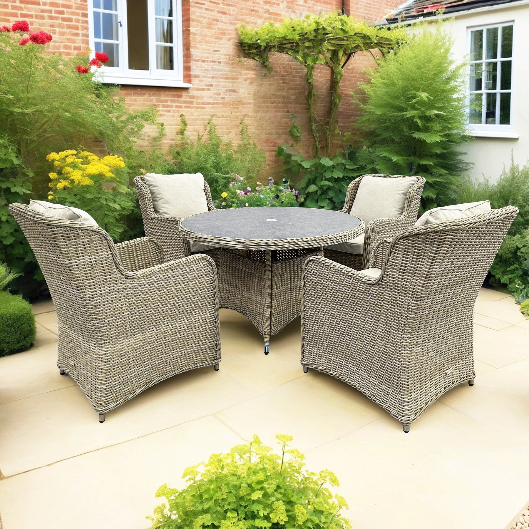 Offering an on-trend hub for outdoor family dining, these 4 Seater Outdoor Dining Sets are made from Polyethylene - a 100% recyclable and weather proof material - leaving you with a long lasting, low maintenance product.