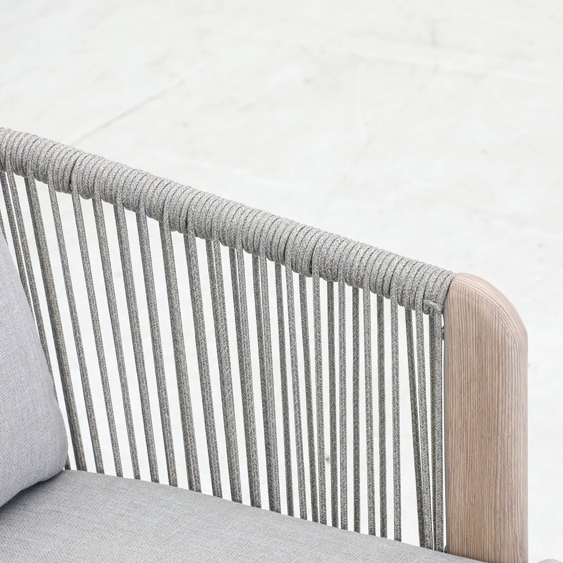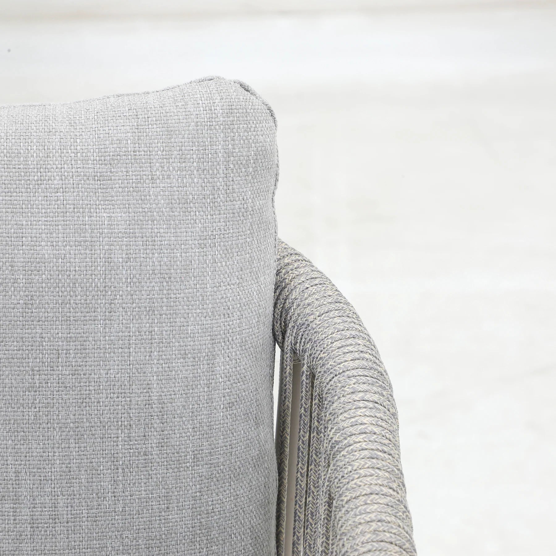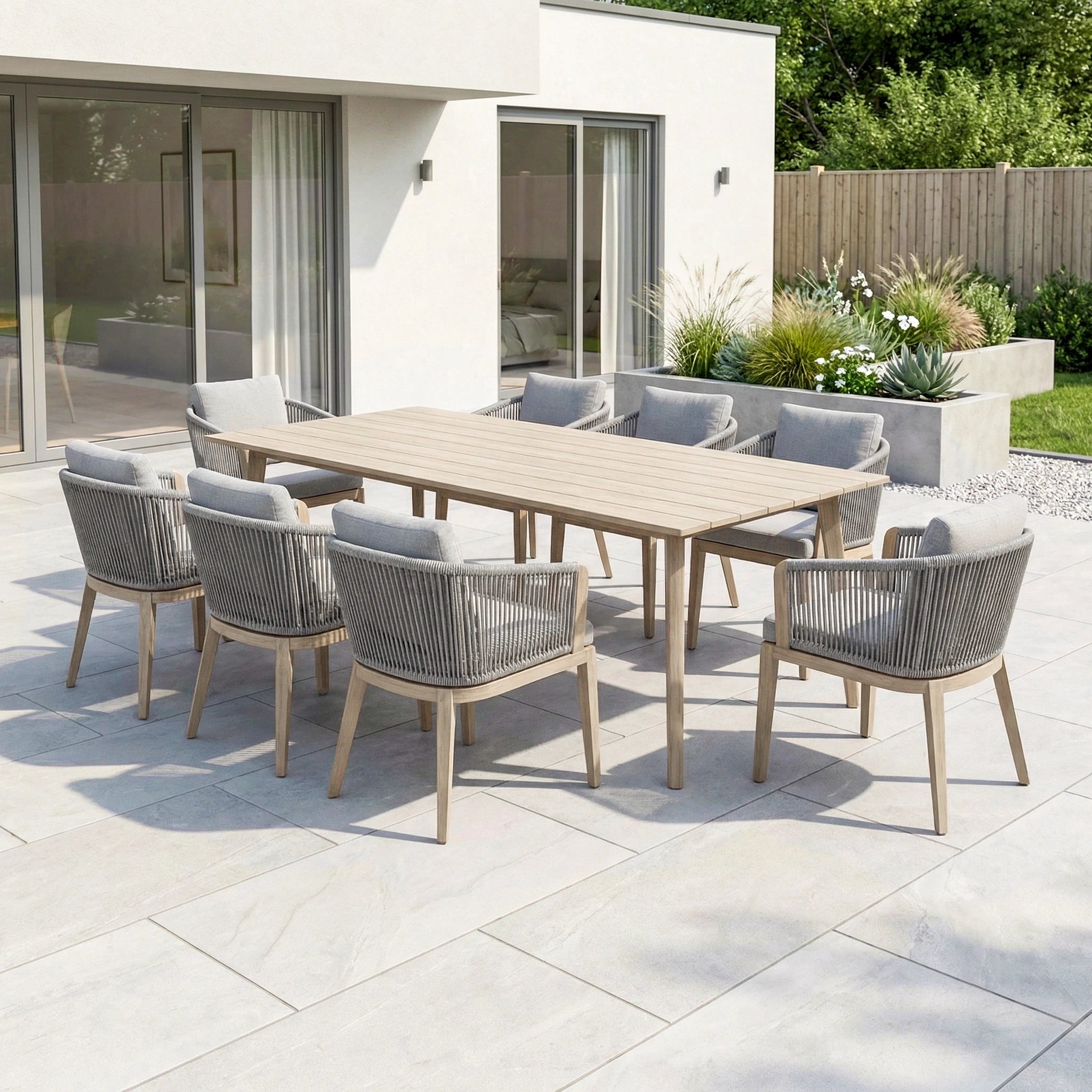Enhancing the visual appeal further, the chairs are finished with elegant knotted rope weave detailing, a sought-after feature in high-end garden furniture. This intricate weave adds texture, strength, and a luxurious feel, perfectly complementing the contemporary design of the dining set.