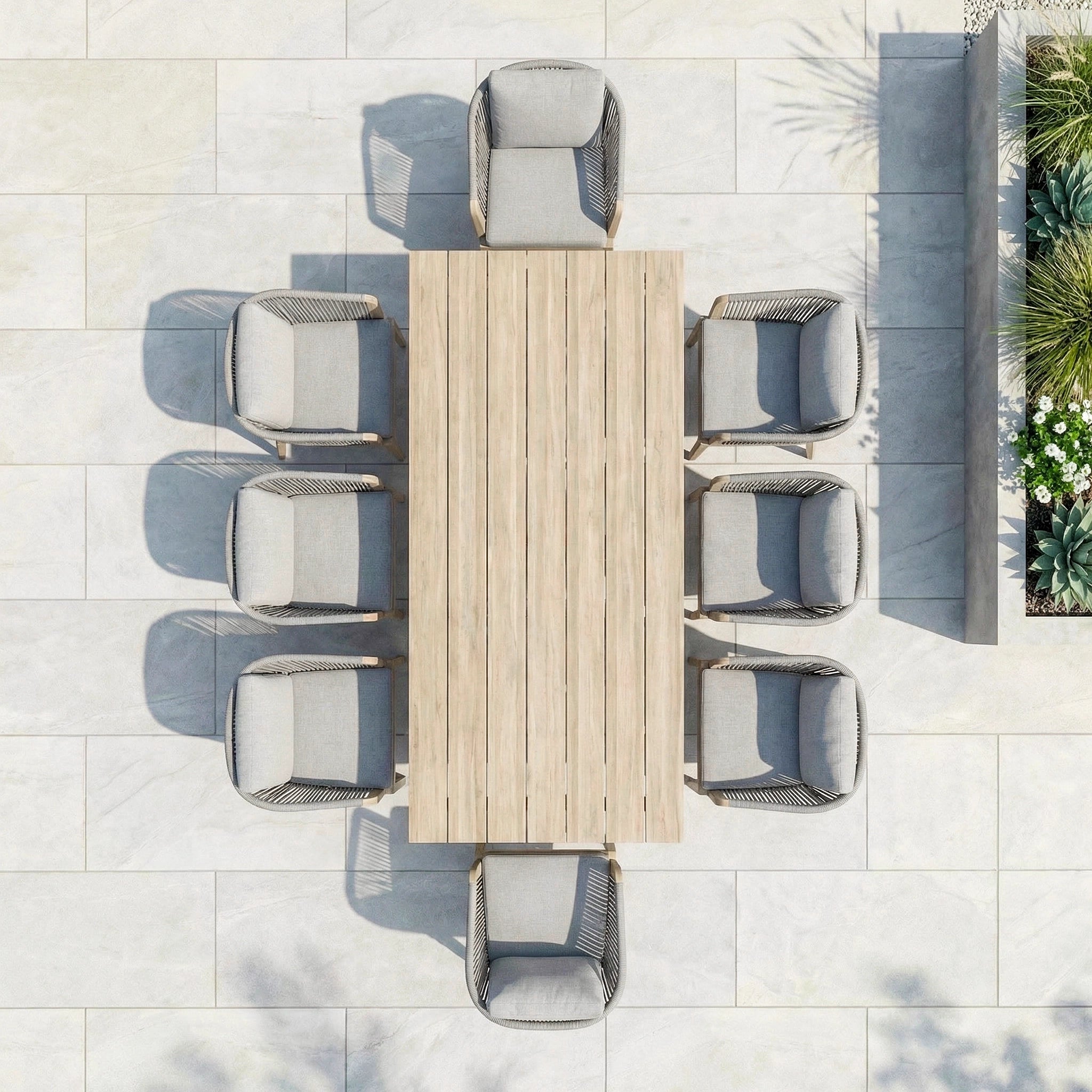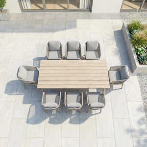The table is nicely paired with eight luxury outdoor dining chairs, showcasing the signature design of the Canberra collection. Each chair features an arched back, delivering a modern yet timeless aesthetic. Designed with comfort in mind, the chairs include deep, supportive cushions. These cushions ensure long-lasting comfort while remaining practical for outdoor use.