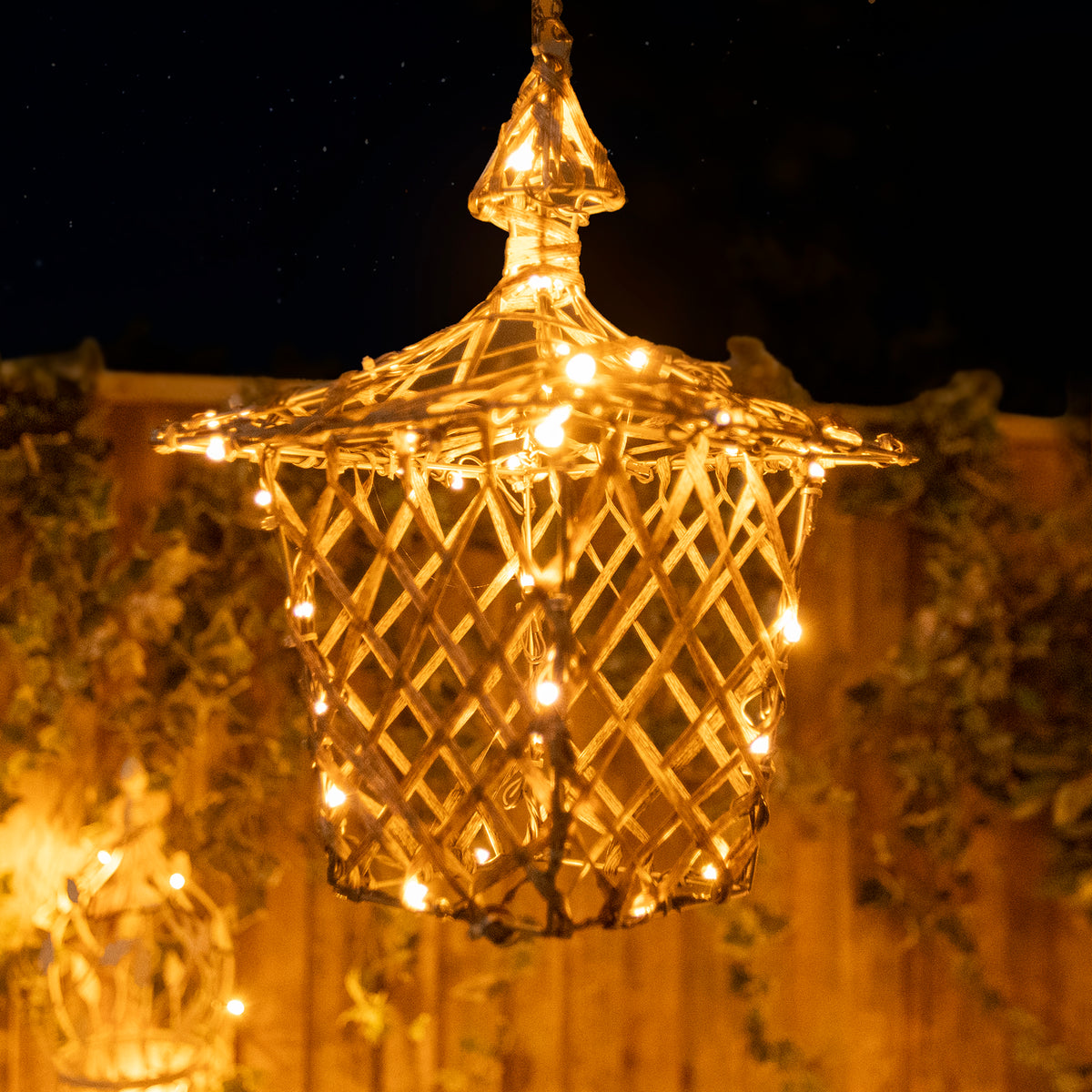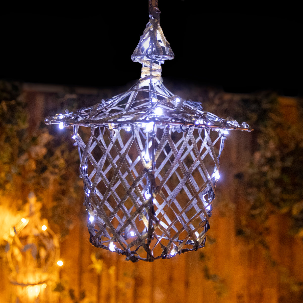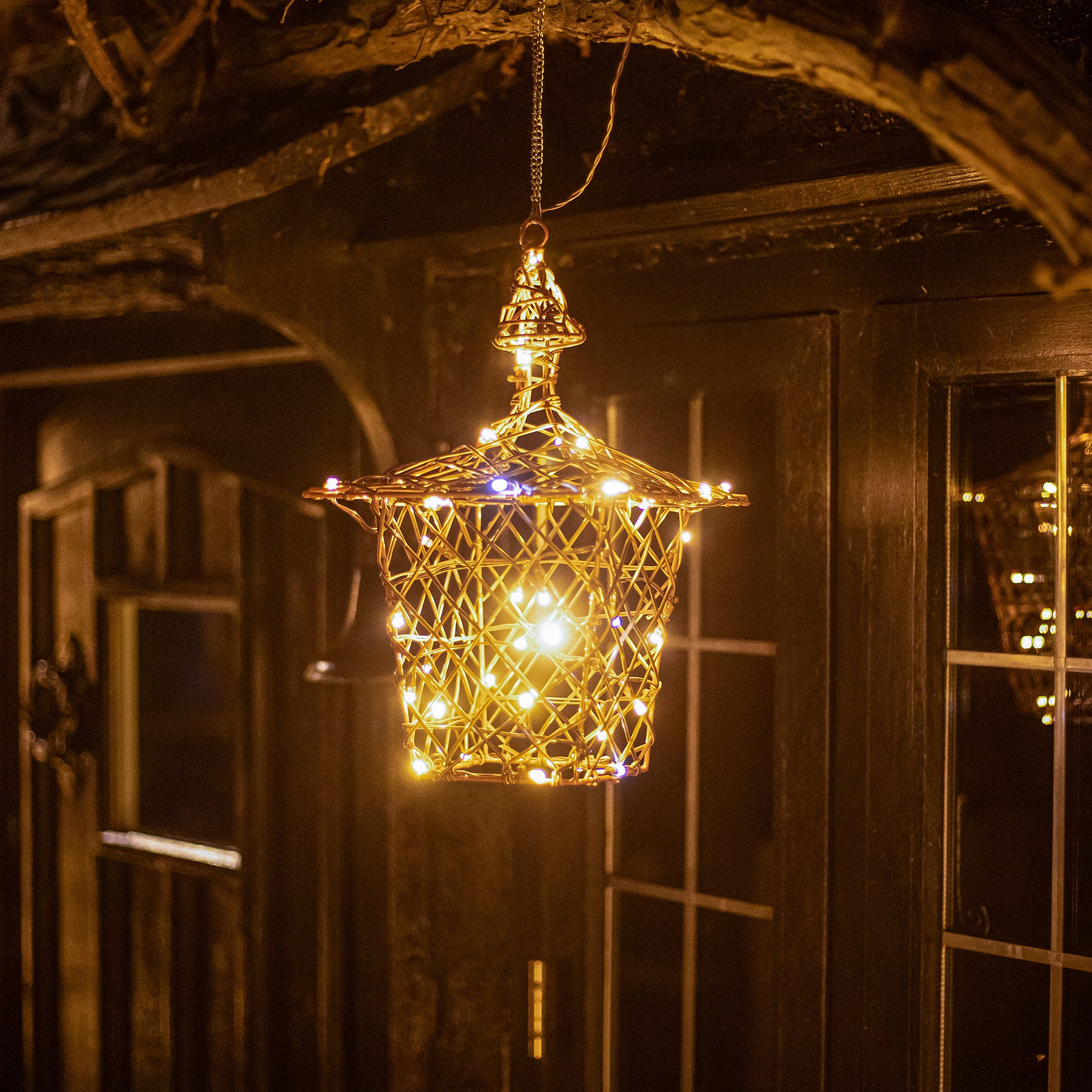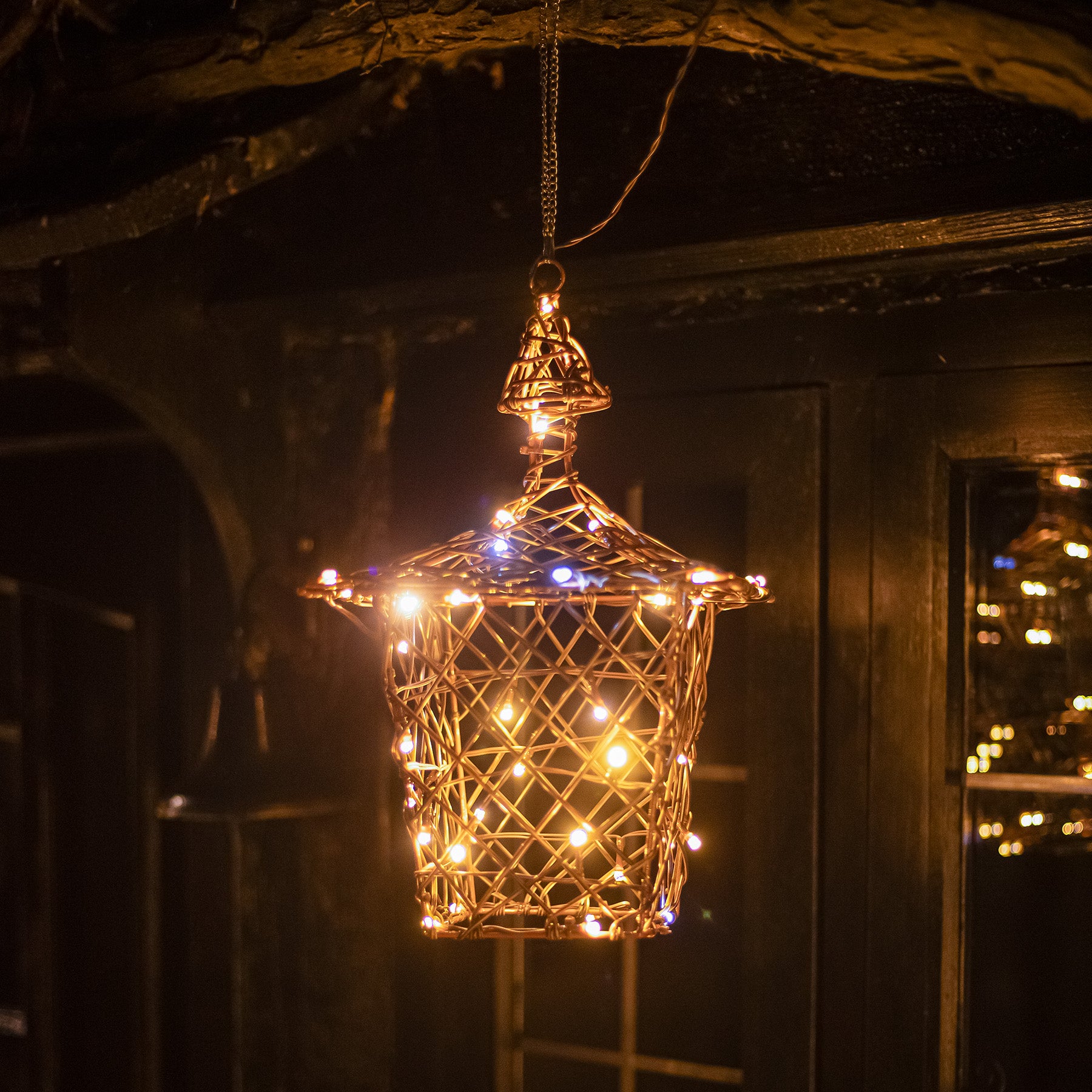 The lantern's brown weave is elaborately wrapped with a wire that is covered with 40 LED lights. With a combination of warm white and multicoloured bulbs, the LEDs beam forth and cast a warm glow around them.