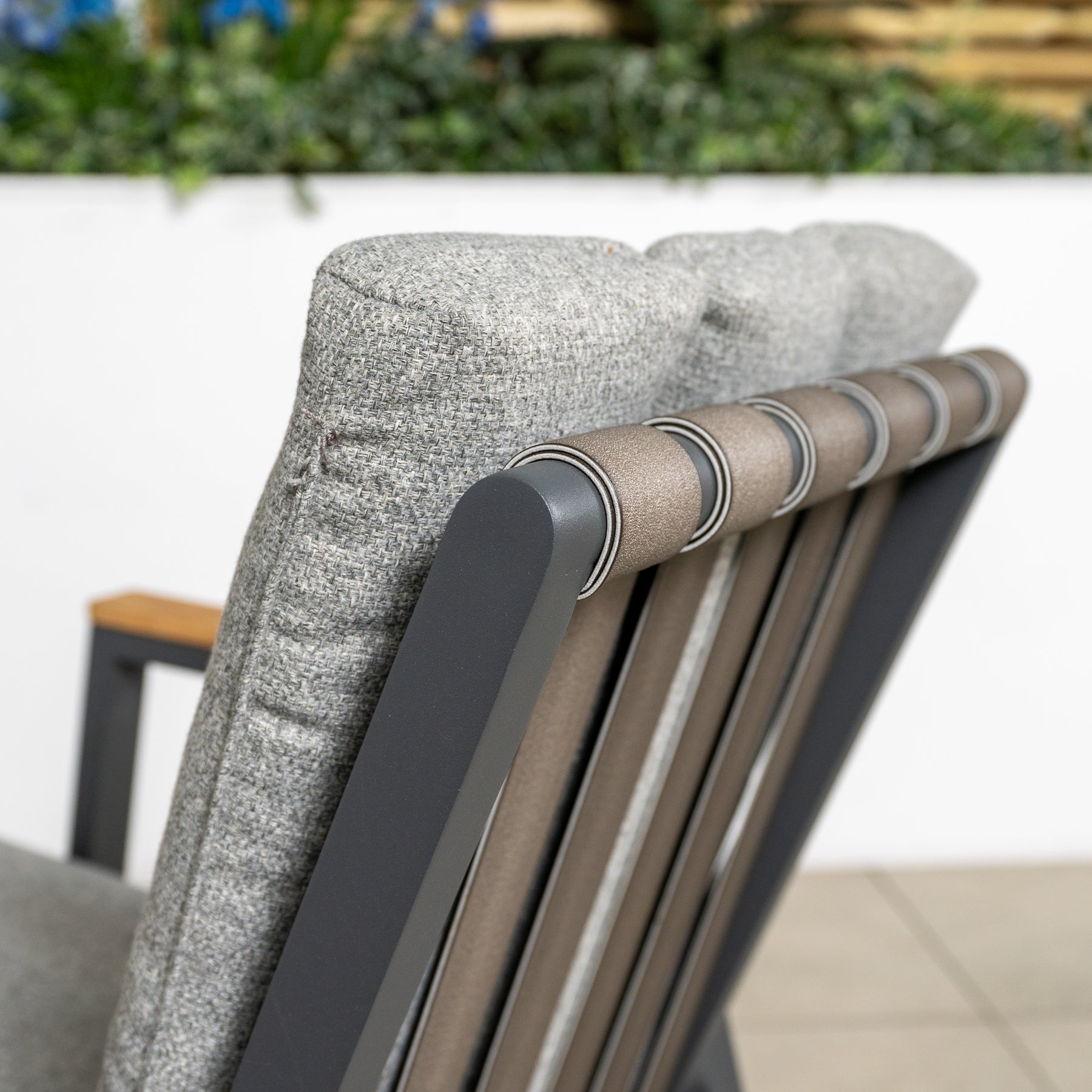 This long-lasting aluminium furniture set is easy to maintain year after year. The season-proof Polyester cushions can be cleaned in the washing machine after removing the covers, and the durable rust-free aluminium frame can be left outside year with little care required. Although the cushions are weatherproof, we recommend taking them from the chairs and keeping them somewhere dry during long showers.