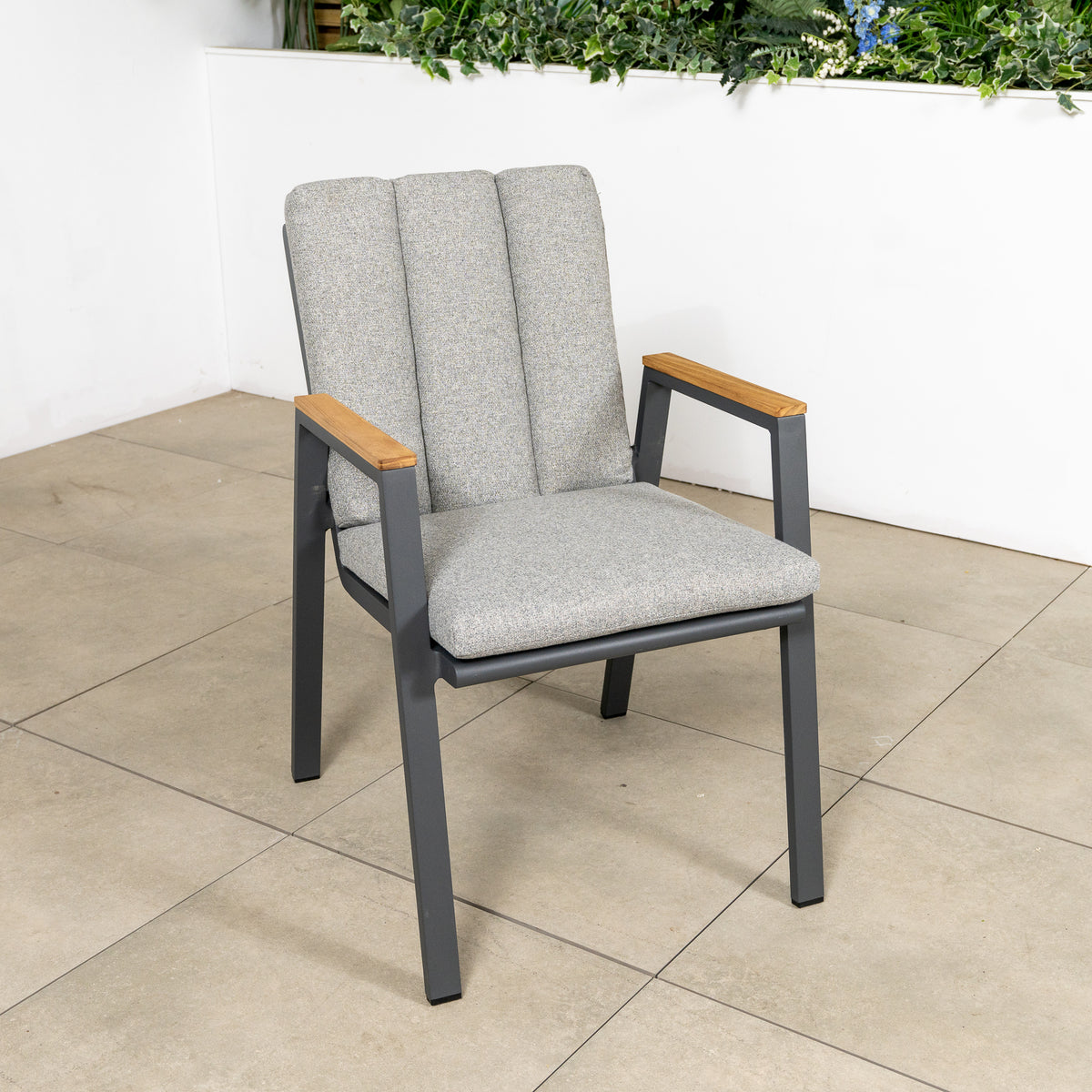 This set of eight aluminium outdoor dining chairs with wood arms and supportive leather slats in the back will impress you with their comfort and style.
