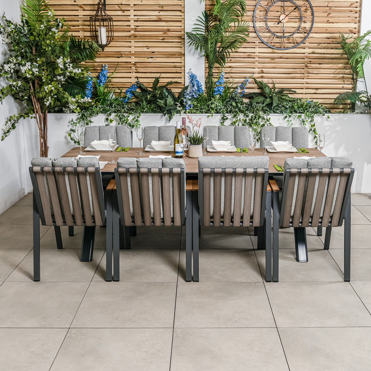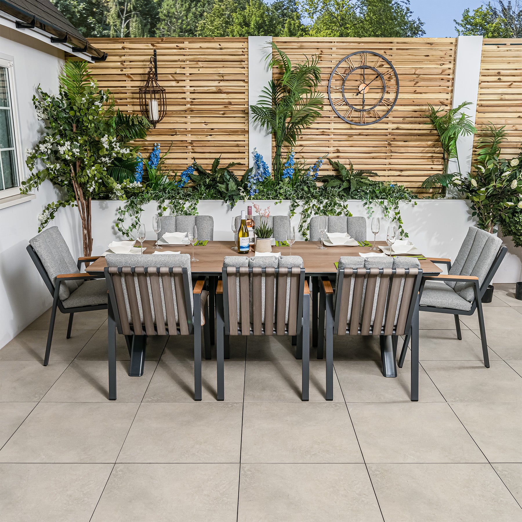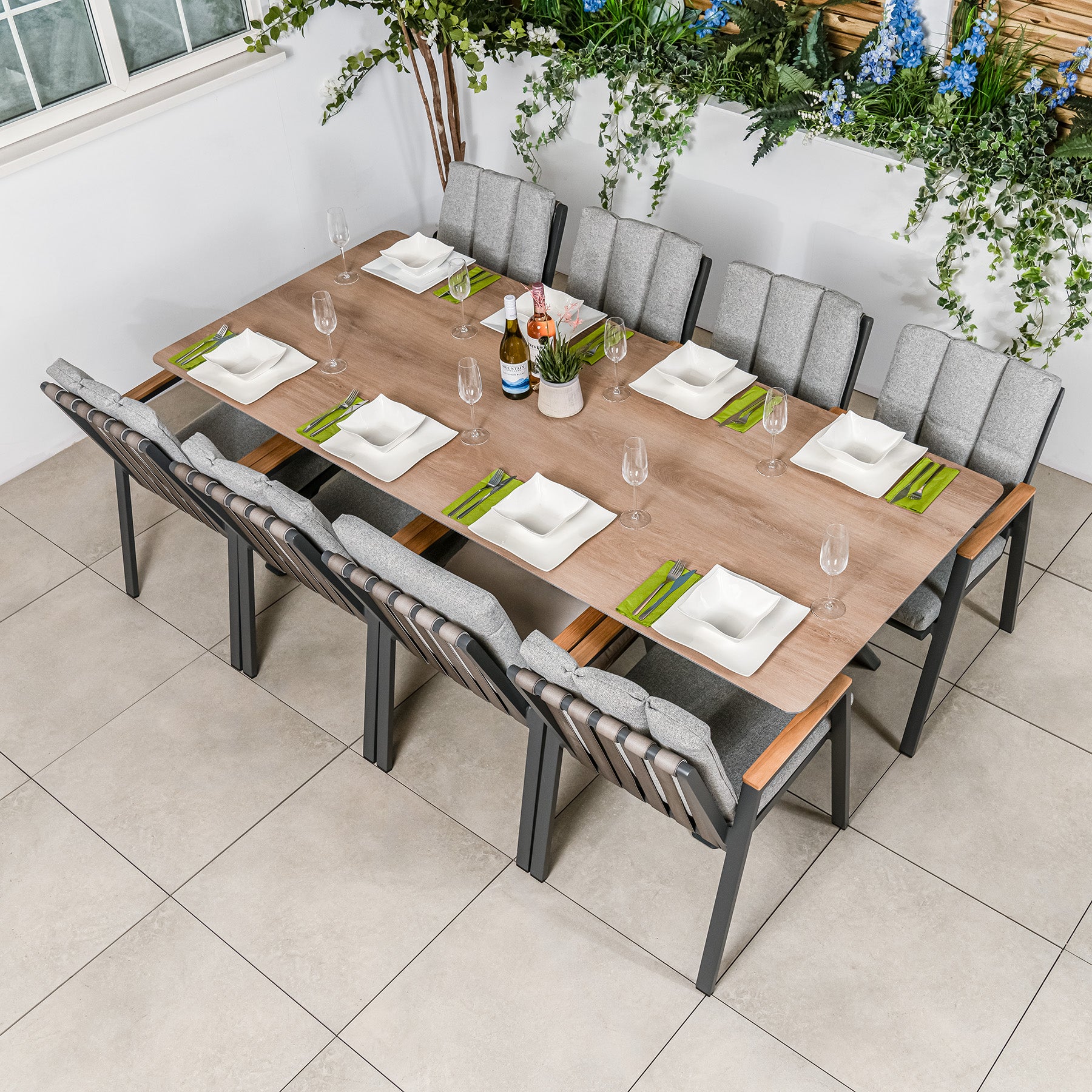It's a lovely spot for entertaining and relaxing with loved ones. The table, with its sleek aluminium frame and smooth, wood effect top, the table is large enough to host an outdoor dinner party.