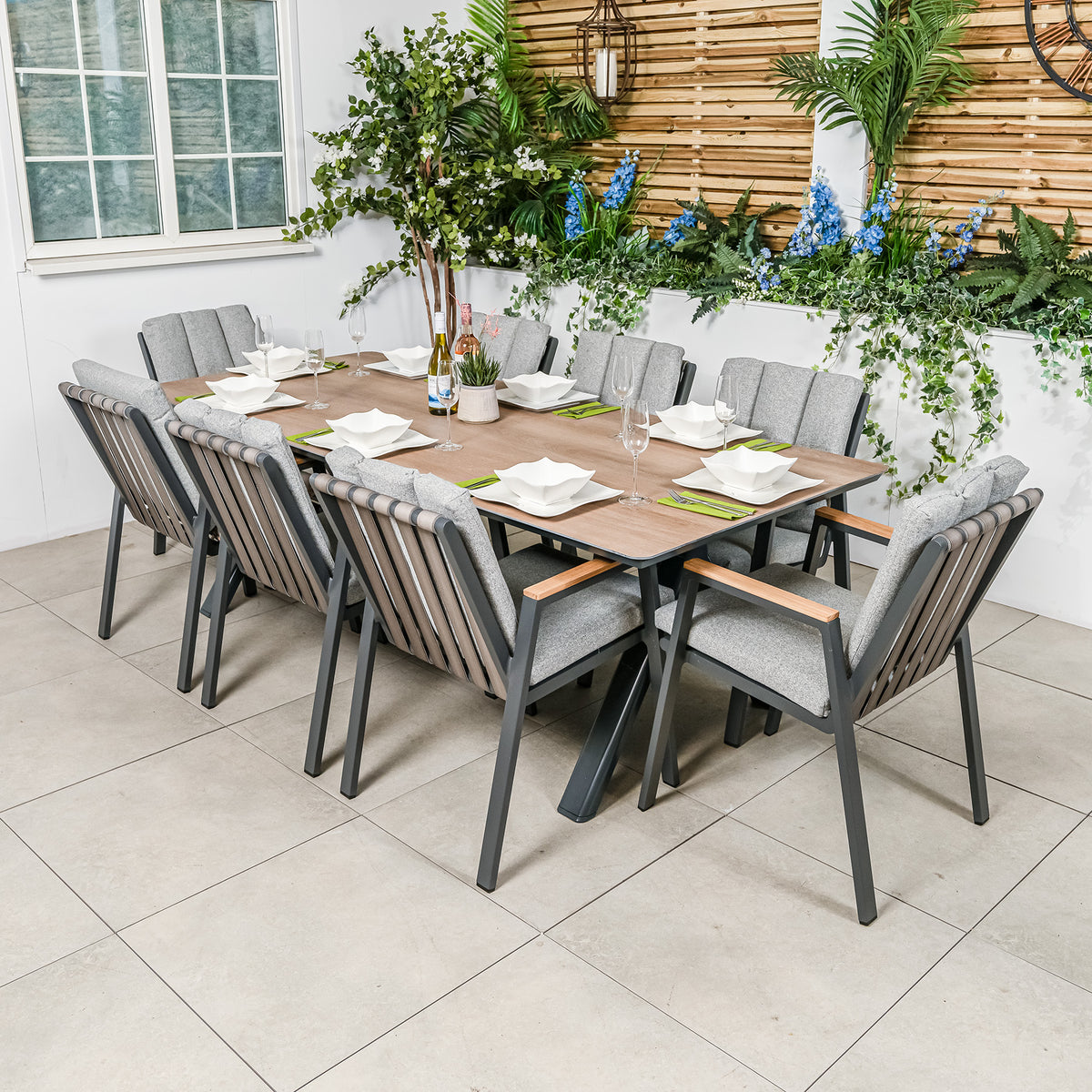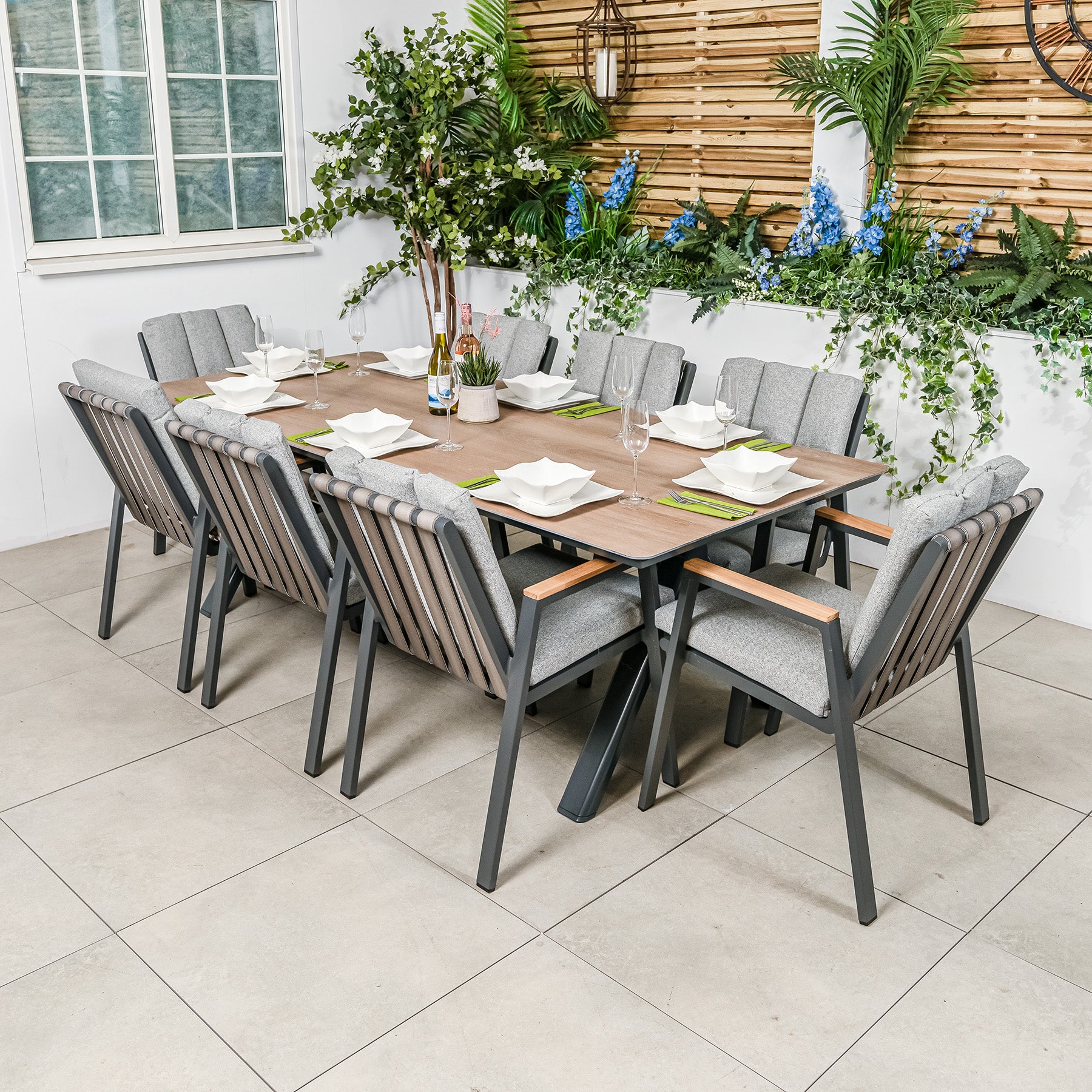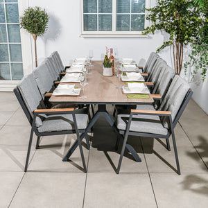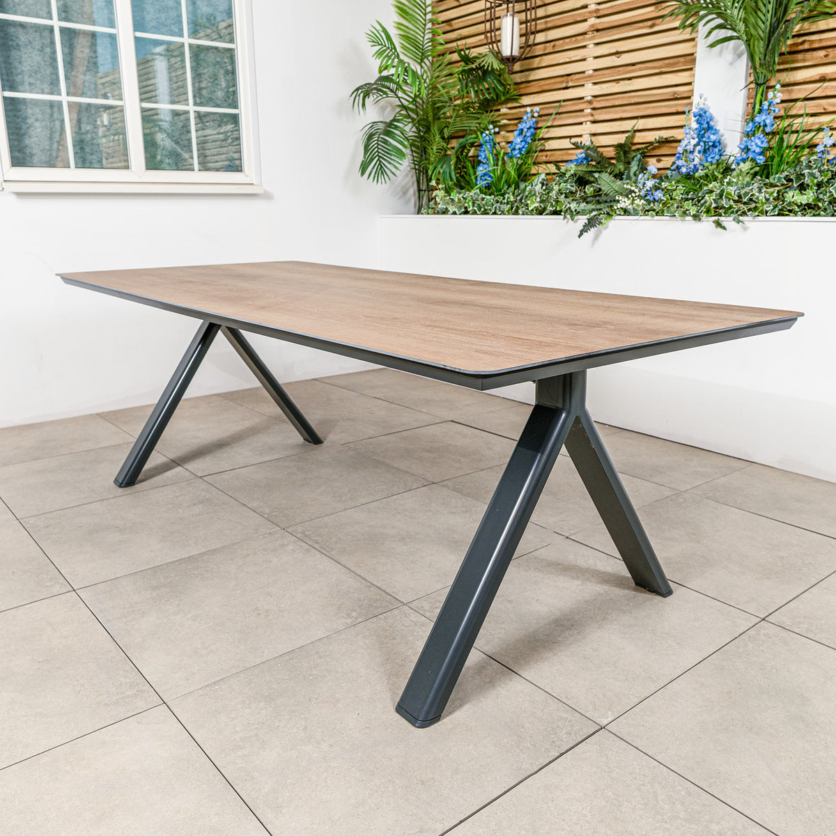 It's a lovely spot for entertaining and relaxing with loved ones. The table, with its sleek aluminium frame and smooth, wood effect top, the table is large enough to host an outdoor dinner party.