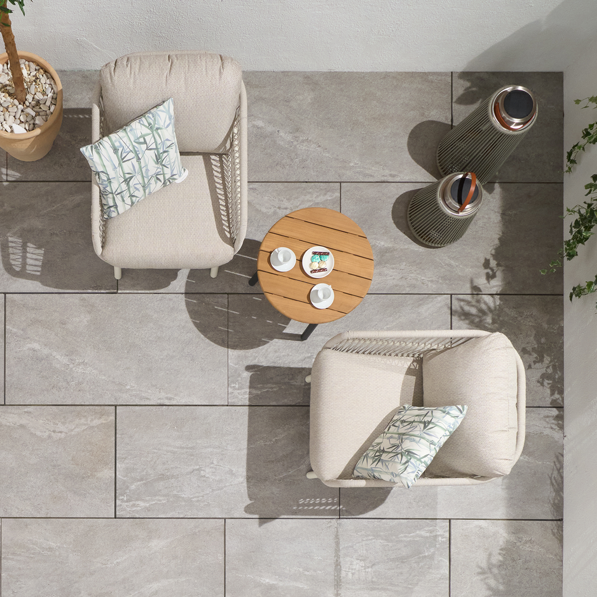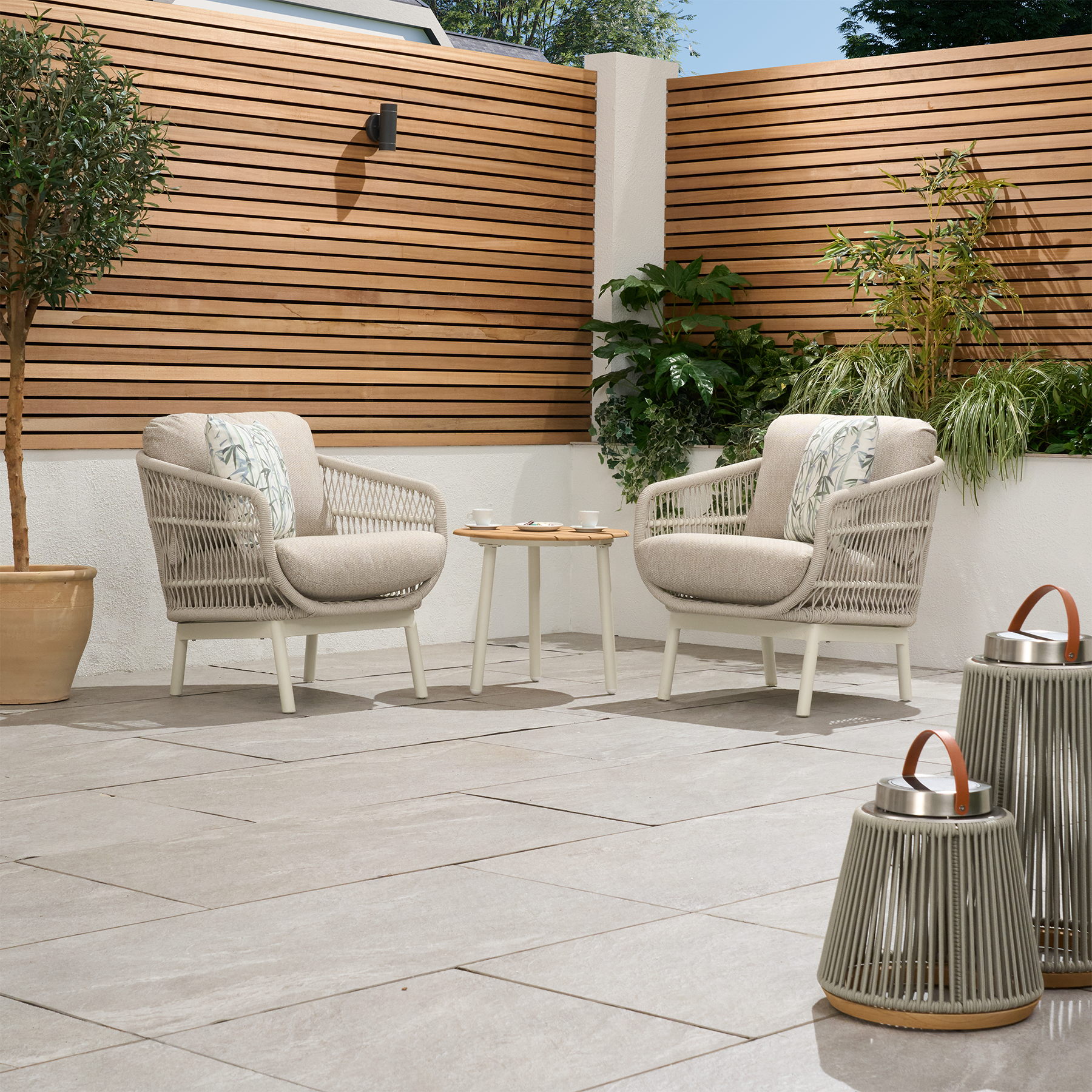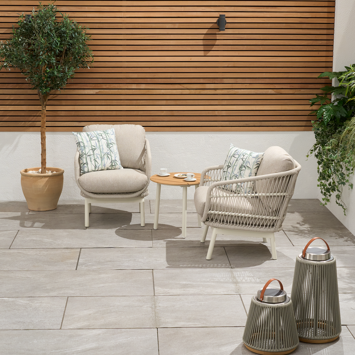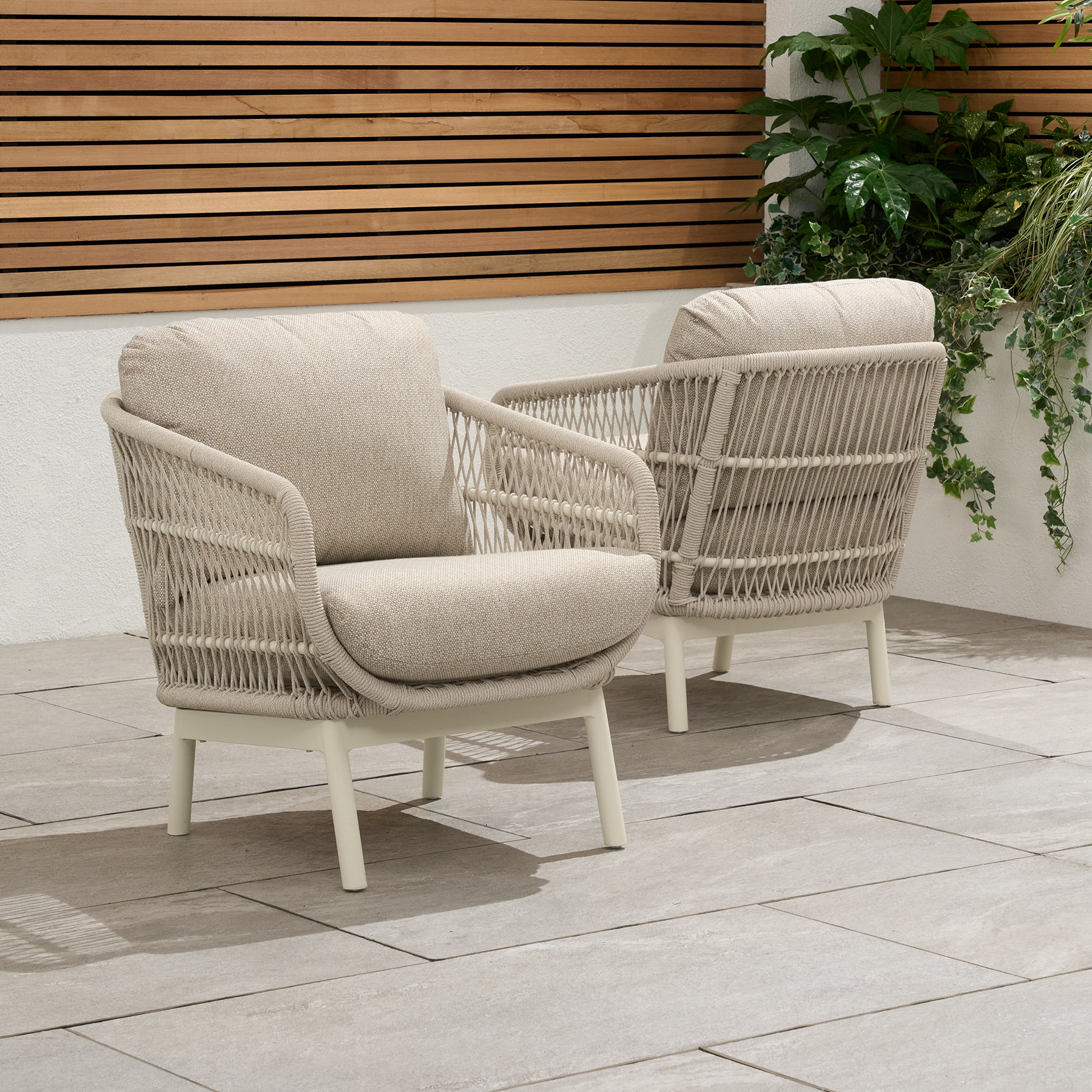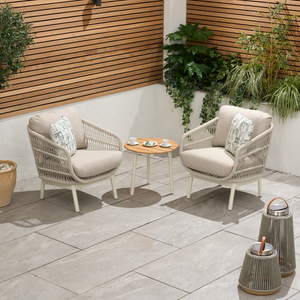 The two outdoor chairs are also the perfect mix of form and function! The aluminium frames give them that solid and long-lasting base, while the rope detailing around them adds such a modern, stylish flair. And the Oatmeal seat and back cushions are definitely a smart choice - they'll fit seamlessly with just about any outdoor colour scheme. The fact that they are showerproof is definitely a bonus, but storing them indoors or in a Rhino Garden Storage Box when not in use will extend their life.
