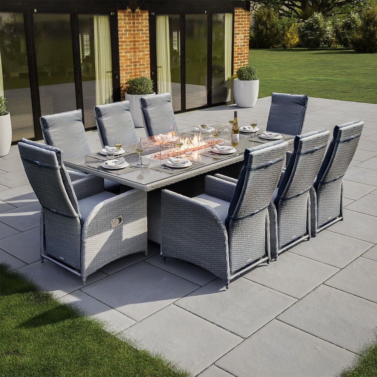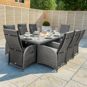 • The Bracken Outdoors Dakota 8 Seat Rectangular Rattan Garden Furniture Set combined with a gas fire pit table and recliner chairs creates a formal outdoor dining set, which enables you to relax after dinner and extend your summer evenings.